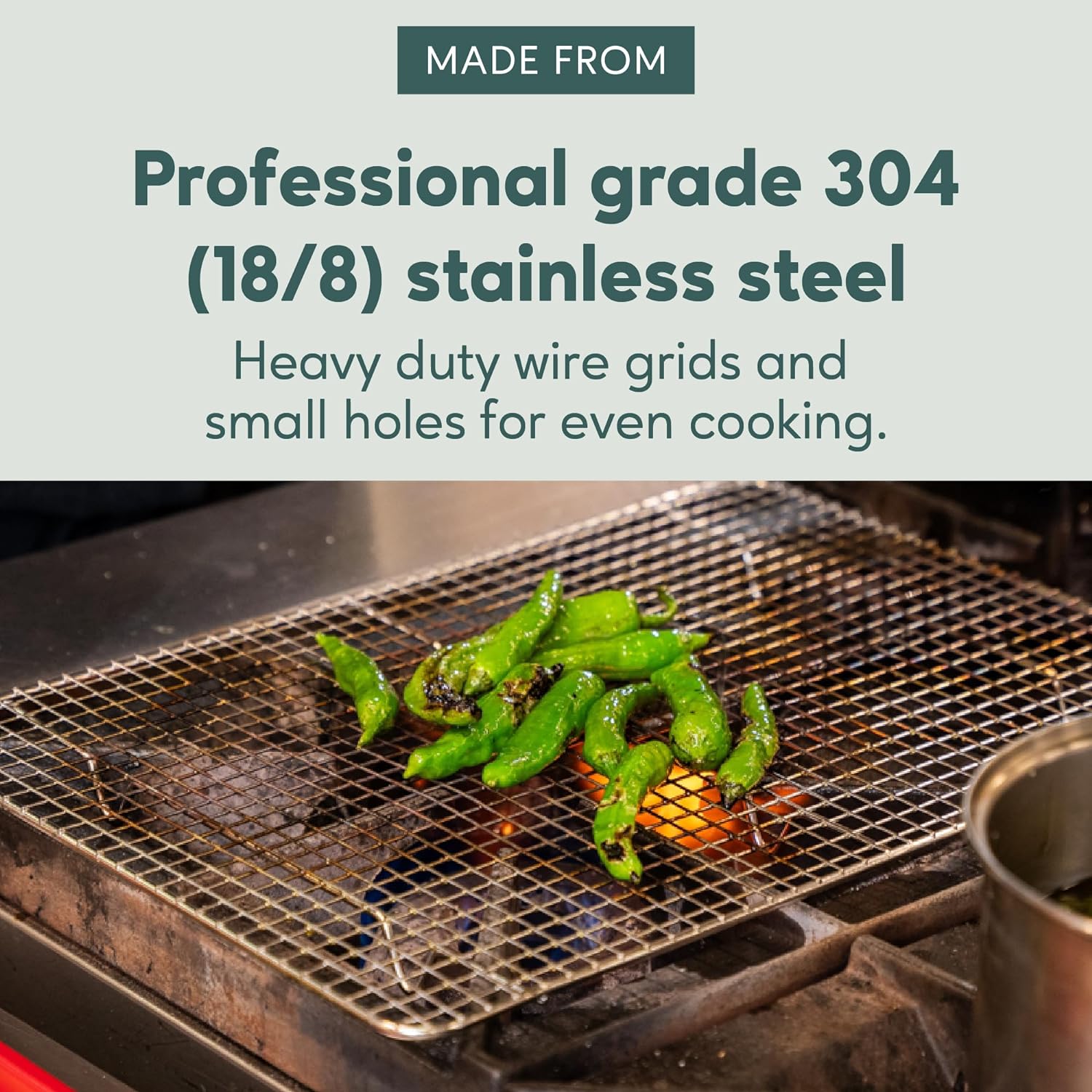 - HEAVY DUTY STAINLESS STEEL STURDY DESIGN: Small cooling rack for jelly roll baking pans is food-safe, professional grade 304 (18/8) stainless steel with strong, heavy-duty wire grid, small holes, smooth no-snag edges, and a full 1-inch height resulting in greater all-around airflow for even cooking, cooling, and roasting every time. Our cooling racks for cooking and baking ensure superior performance.