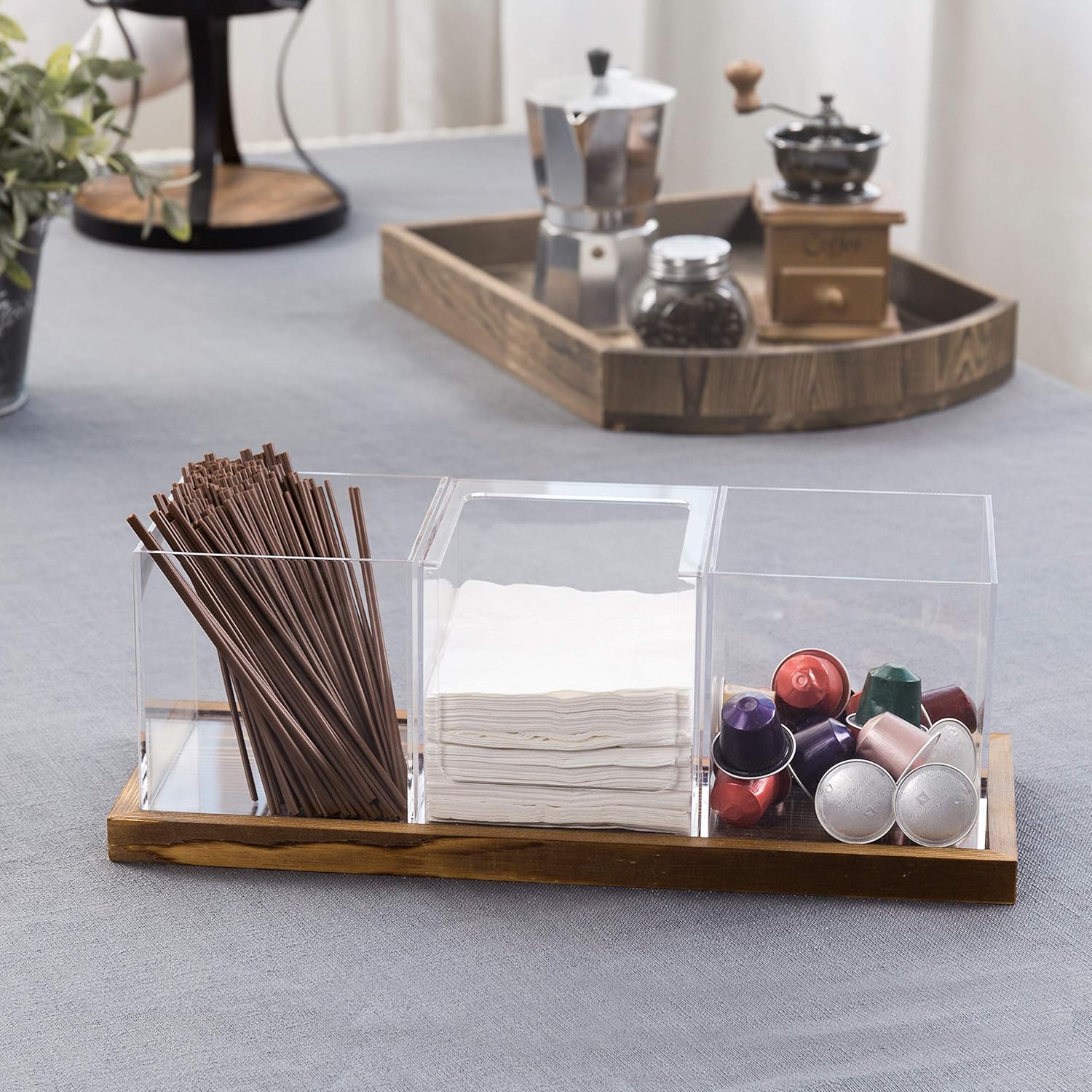 - 4-piece set modular clear acrylic and rustic burnt wooden coffee and tea station organizer conveniently keeps drink accessories within reach at a home, office, or business