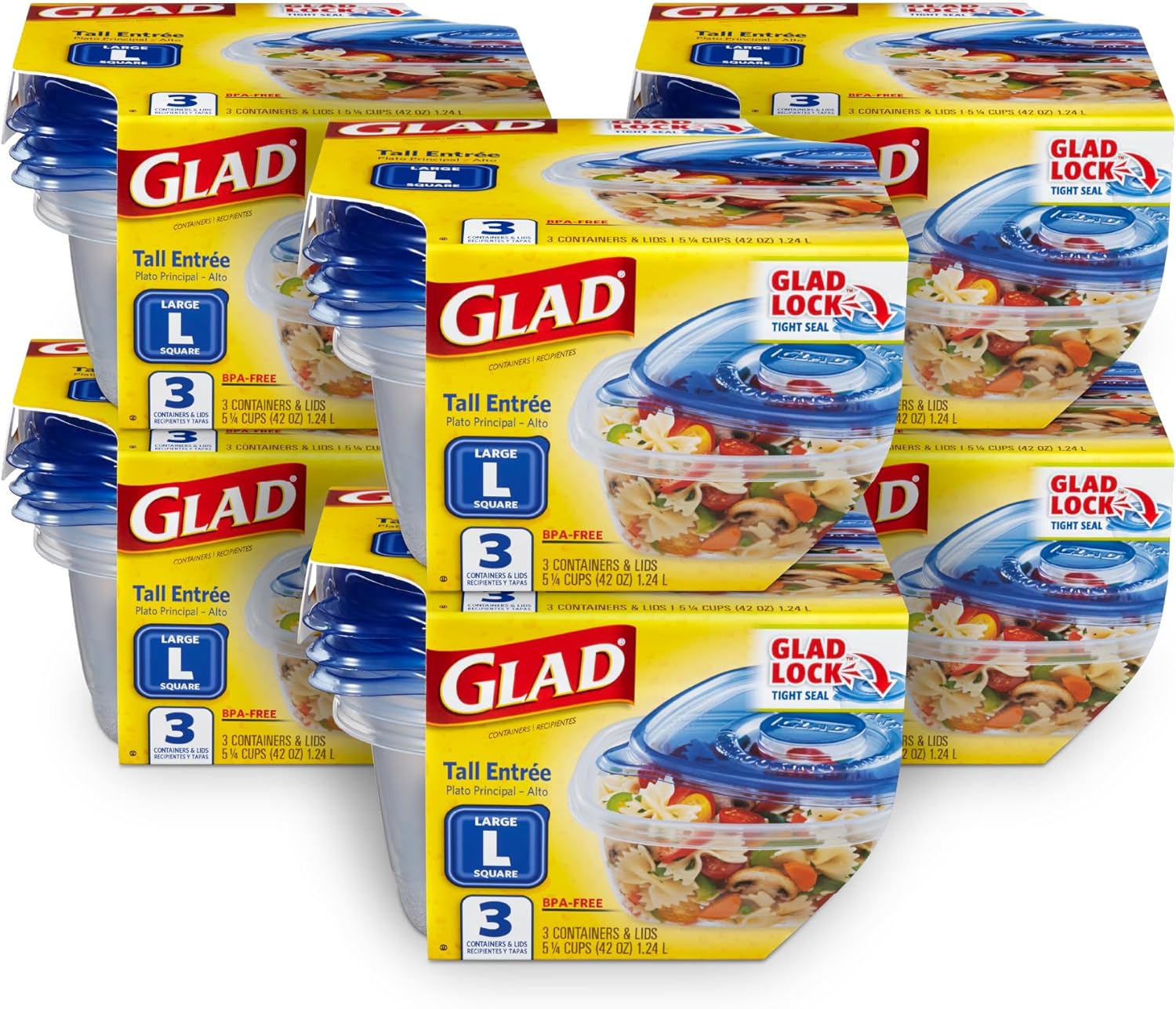 Glad GladWare Tall Entree Food Storage Containers - Large Square - Meal Container Holds up to 42 Ounces of Food - Lock Tight Seal, 3 Count - 6 Pack