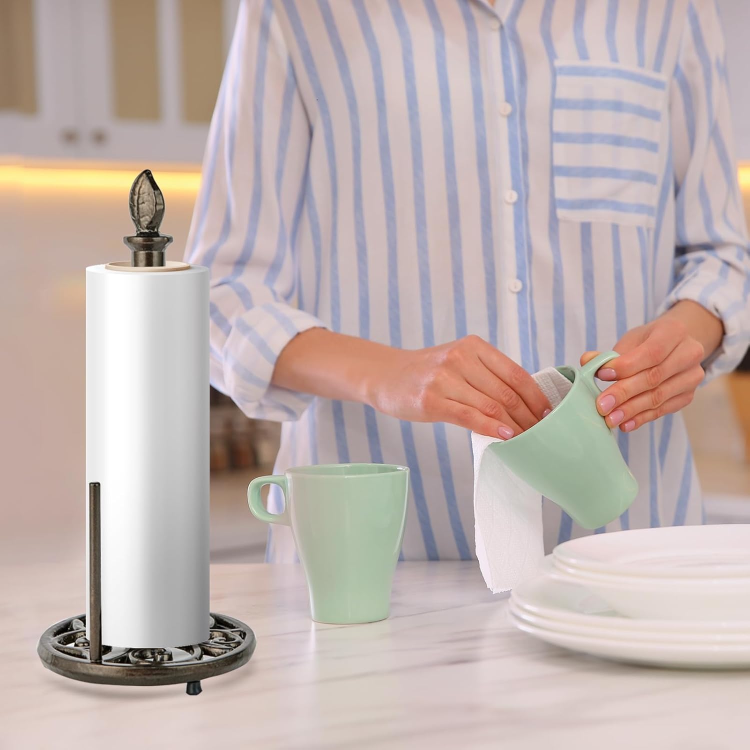 - Decorative & Practical: Vintage paper towel holder will be charming in your kitchen countertop as home decor. The compact design takes up minimal space while still providing room to store one roll of paper towels; Fits both standard and large jumbo rolls of disposable paper towels