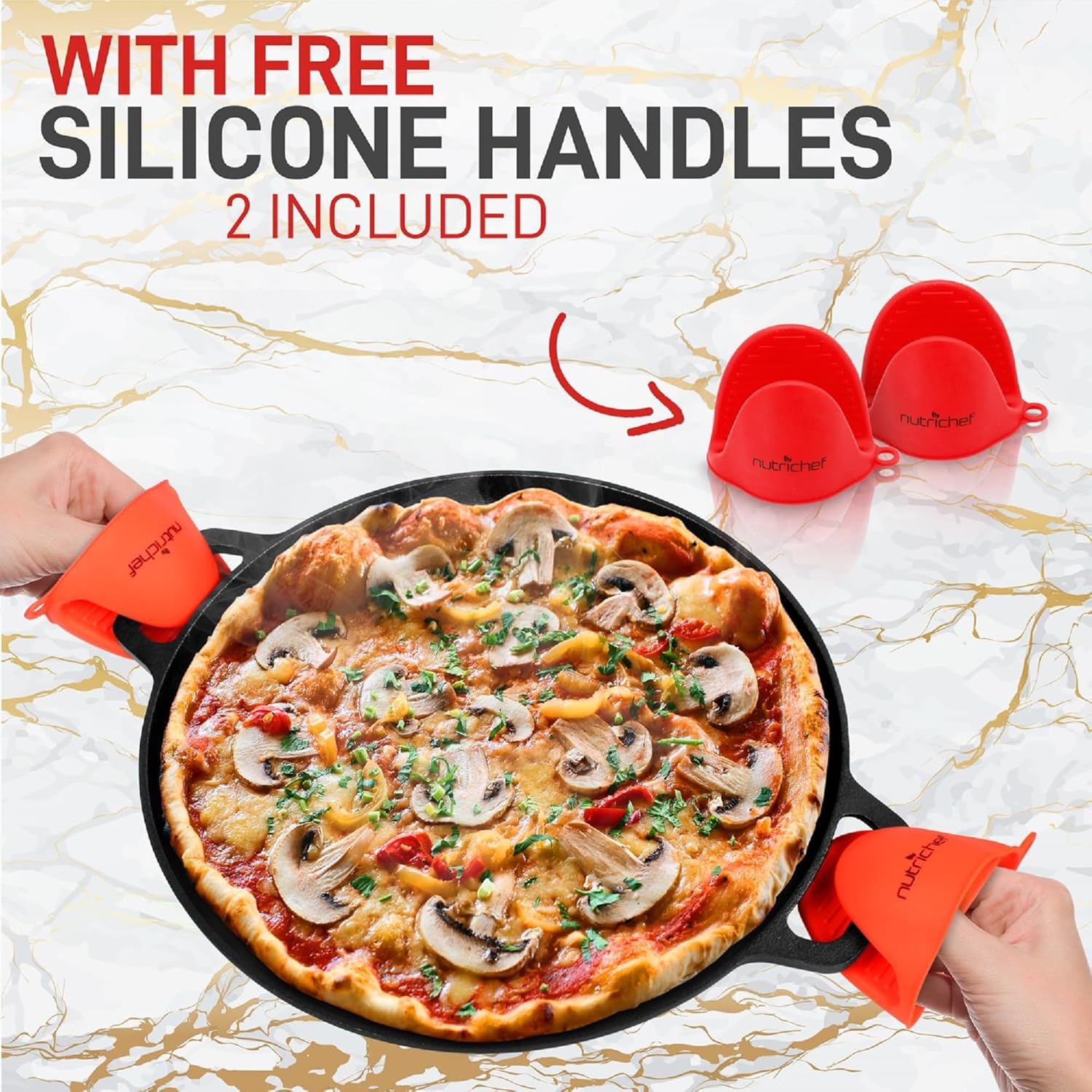- HEAT SAFE UP TO 500Β° F: NutriChef pre seasoned cast iron pizza pans are heat-safe at high temperatures up to 500Β°F (260Β°C). Features wide diameter size for large meals & includes 2 orange silicone handles. Also ideal for chicken, steak & veggies