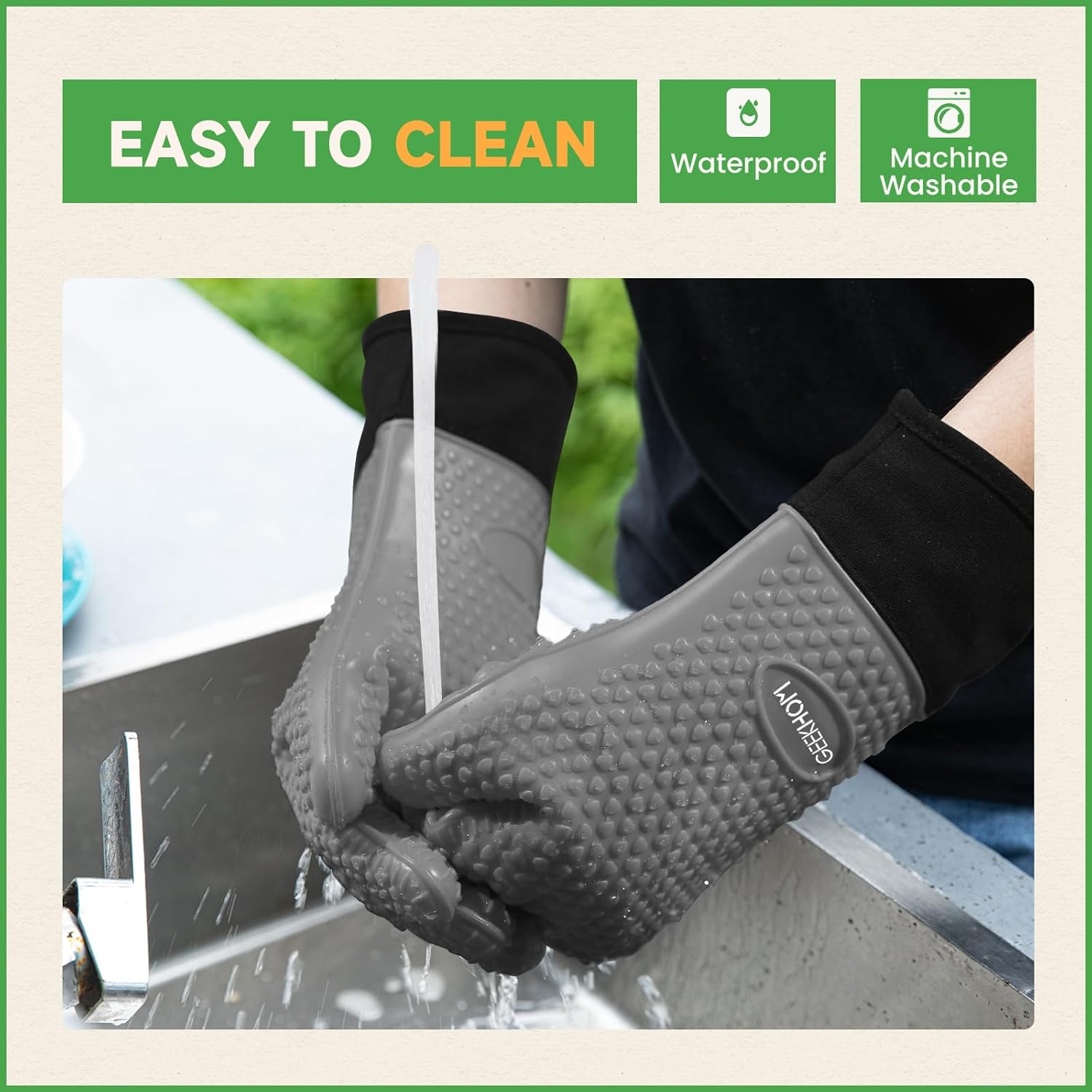 - Effortless Cleanup, Smarter Kitchen Flow: Waterproof silicone repels hot grease and marinade spills, while dishwasher-safe design erases stains in minutes; Hang the oven gloves compactly with the built-in loop—ideal for small kitchen spaces or tossing into camping gear without bulk