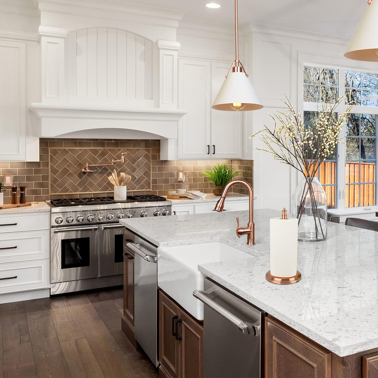 - MODERN & ELEGANT: Designed by Akicon is a classical stand up paper towel holder with smooth, elegant lines and a modern copper finish that is sure to enhance your kitchen dΓ©cor.