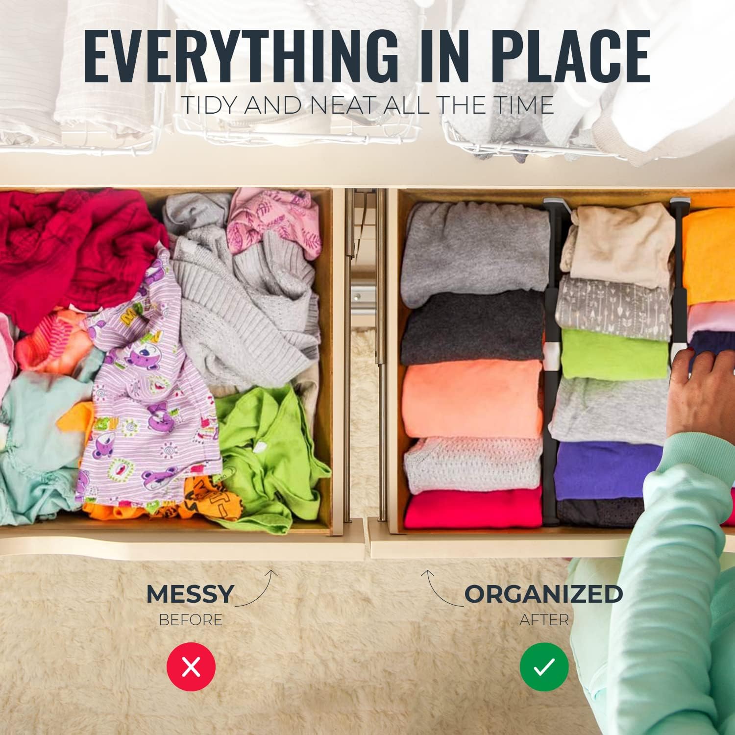 - 13-22 Inch Expandable and Adjustable: Extra-tall dresser drawer divider with slide-and-lock installation for easy customization; no tools or glue needed; securely adjusts and locks in place for a tailored storage solution