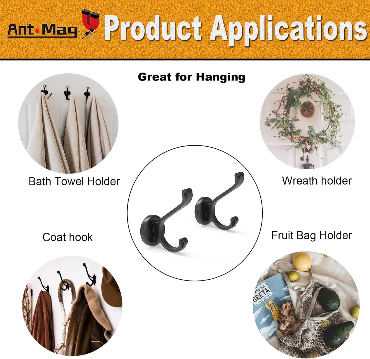 - 【REINFORCED MAGNET】Ant Mag magnetic hooks are made of the strong neodymium magnet, which produces an intensive force of attraction that holds up to amazing 140lbs on vertical hanging and 35lbs on horizontal hanging.