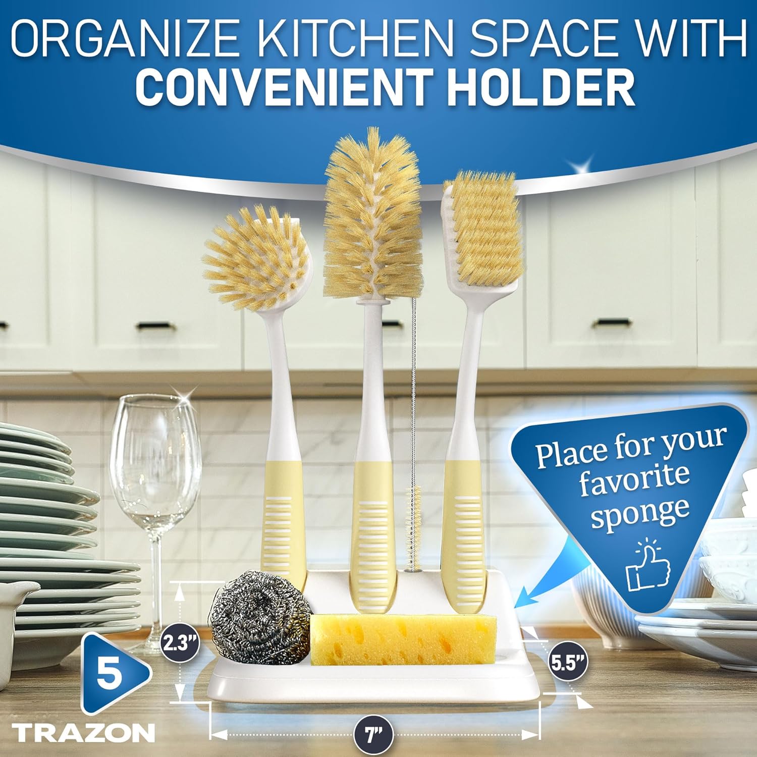- Kitchen Dish Brush Set of 5 Pieces - Includes a dish brush with handle, dish scrub brush, bottle scrubber brush, straw brush, and a holder for convenient brush storage.