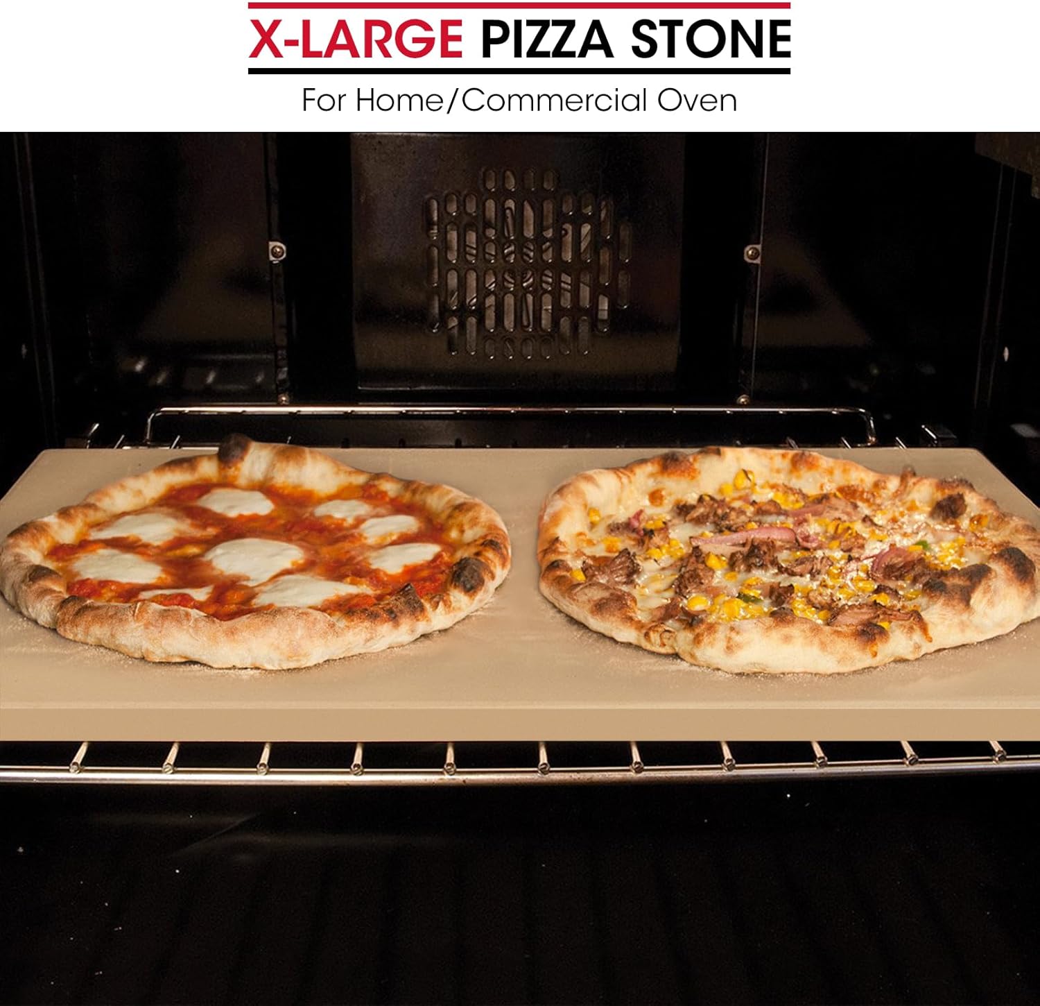 - X-Large Pizza Stone for Oven and Grill: 24" x 12" x 0.6"(15mm), weighs around 12 lbs, allows to bake multiple pizzas or loaves at the same time. Fits large range ovens, convection ovens, commercial ovens and grills with inner cavity larger than 26"L x 14"W, does not fit 30" compact ovens. Make sure you have at least a 1-inch gap around your stone for a proper fit and good ventilation