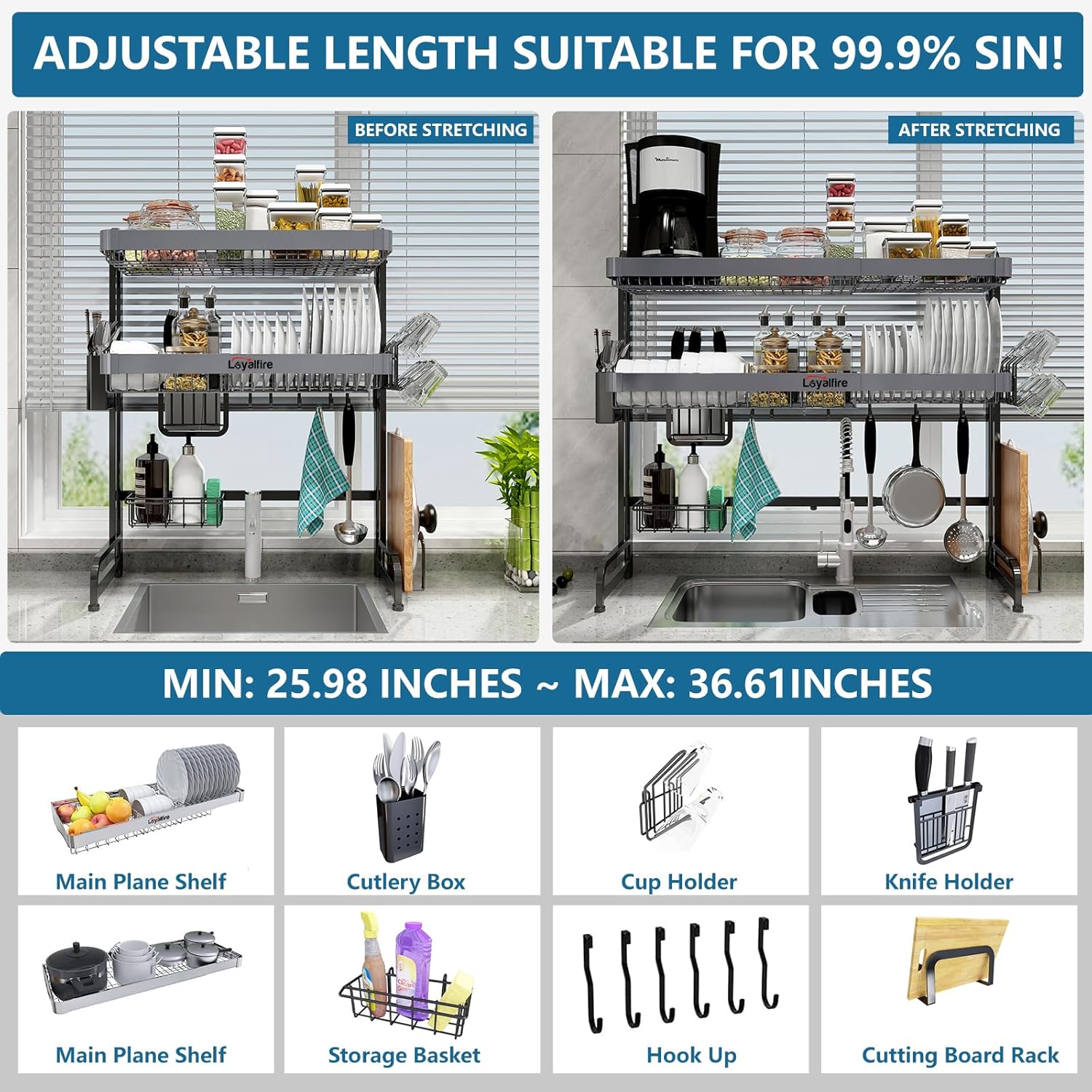 - FIND THE RIGHT DISH RACK FOR YOU: please carefully measure 3 numerical values: The width of your kitchen sink, the height of the faucet and the height between the cabinet bottom to the countertop before buying.Loyalfire provide lifetime after-sales service for this kitchen rack.