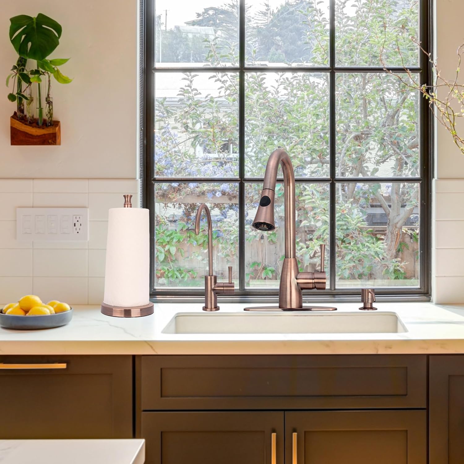 - MODERN & ELEGANT: Designed by Akicon is a classical stand up paper towel holder with smooth, elegant lines and a modern copper finish that is sure to enhance your kitchen dΓ©cor