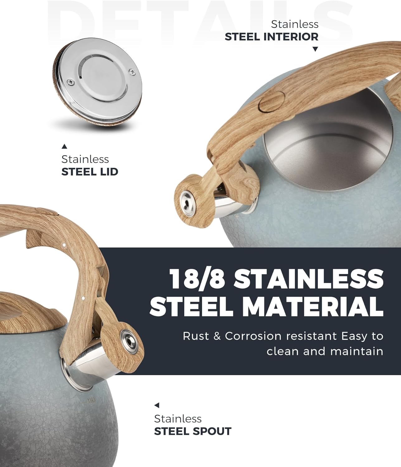 - Fast Heat Base: The tea kettle designed with a generous 8 in base can maximize the heat conduction to increase the efficiency of boiling. High grade stainless steel is suitable for any heat source including gas, electric and induction.
