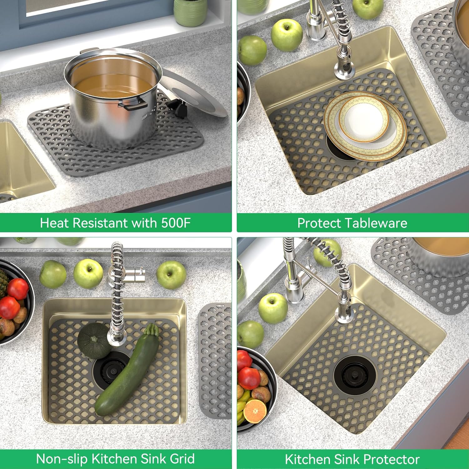- Heat Resistance: Silicone drying mat for kitchen sink can handle temperatures up to 500F so you can safely place hot pans and dishes on the sink mat directly from the oven or stove to prevent damage to the table from the heat