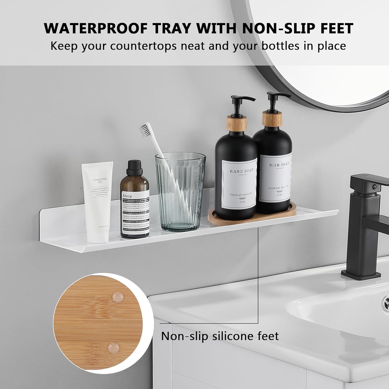 - Super organized and classy: Waterproof smooth tray keeps soap dispensers nicely together and keeps the counter more clutter-free, and doesnβt take up much room. The tray has a non-skid bottom keep bottle will stay in place during operation even when the counter is wet, also protect the counter from scratches. Add a touch of elegance to a boring sink area, get compliments about it whenever guests are over. ADD TO CART now.