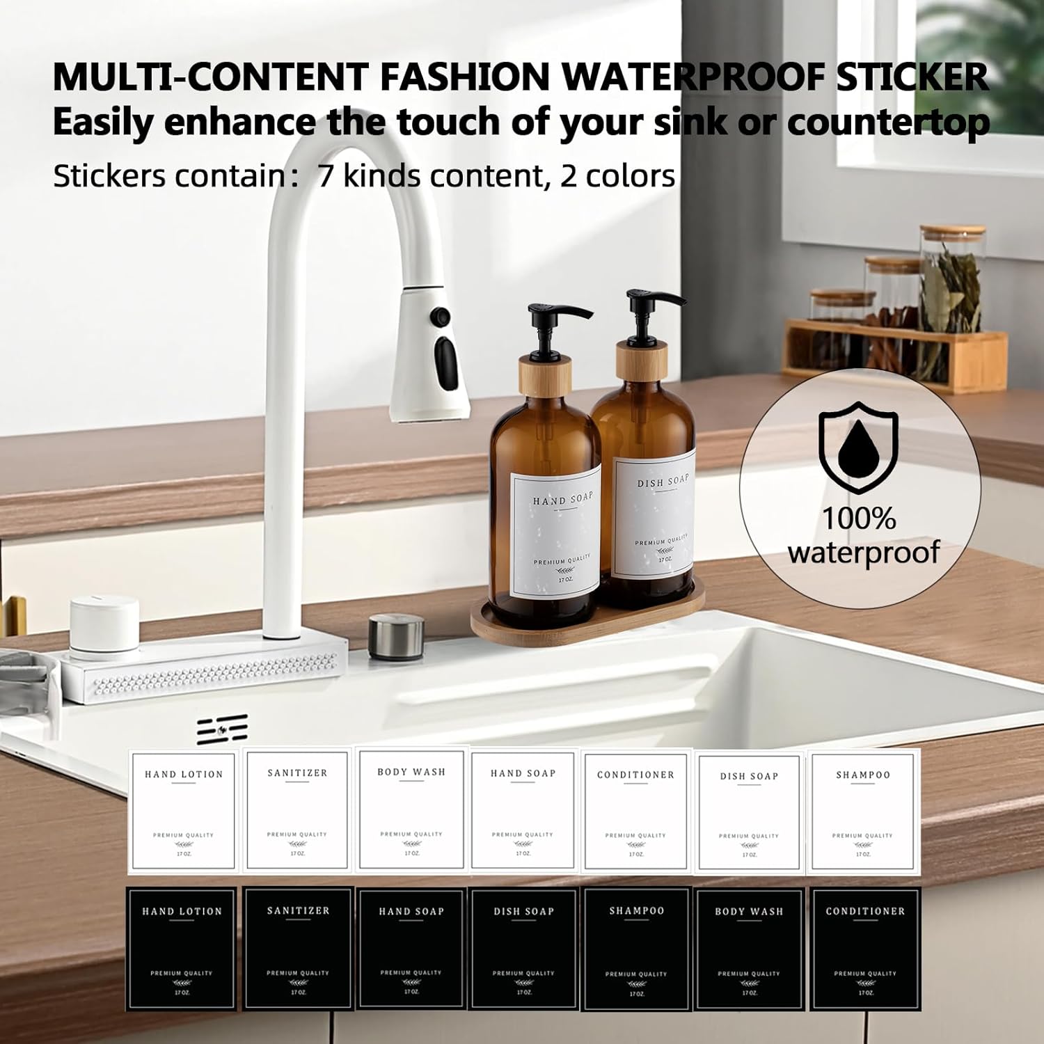 - Elevating your kitchen and bathroom experienceοΌThis Soap Dispenser Kitchen with minimalist modern farmhouse chic style waterproof stickerοΌ14pcsοΌpretty versatile customize the labels to your taste, can also change the labels out if you decide to change the look/colors match your decor. Waterproof material don't peel even when it gets wet and moist every day, perfect for the modern farmhouse vibe or really any kitchen decor.