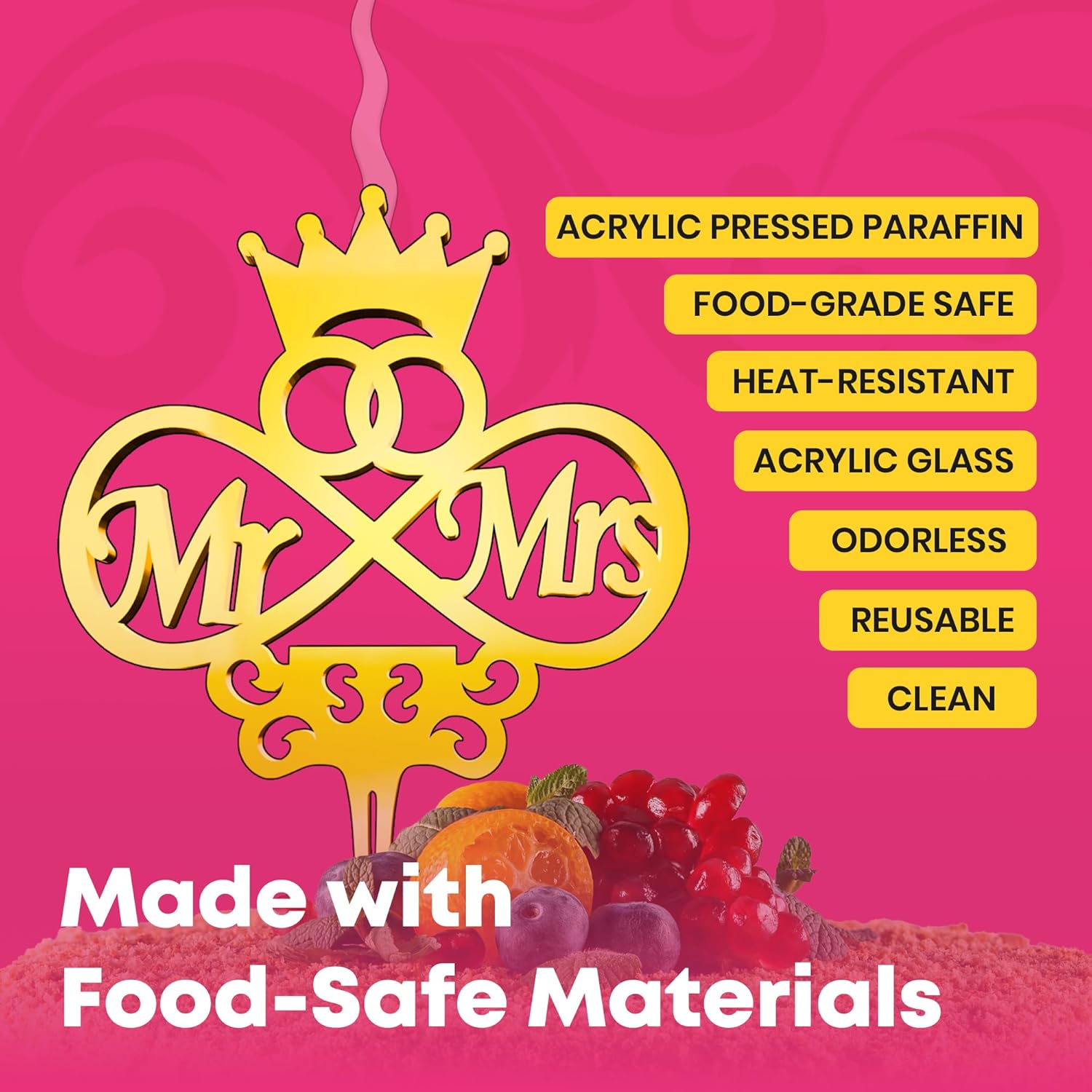 Mr and Mrs Reusable Gold Romantic Cake Candle - Luxury Cake Topper Candle for Birthdays, Weddings & Anniversaries - Reusable Food Safe Acrylic, Shiny Mirror Finish - Happy Birthday Cake Topper Decor