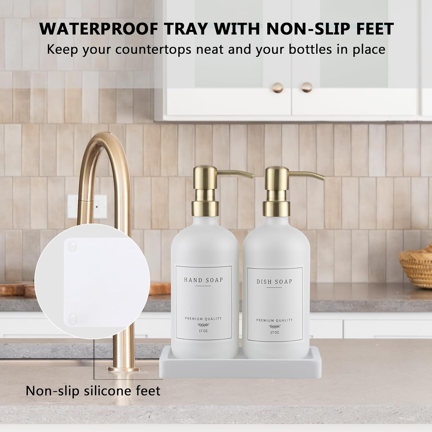 - MORE CLEAN AND ORGANIZED: This farmhouse style bathroom soap dispenser set is elegantly decorative and functional, keeps your kitchen or bathroom clean and classy, the white spill-proof tray with non-slip feet on the bottom is not like other wood that cracks easily, sturdy tray keeps your partner from moving the bottles all around the sink and doesnβt take up much room, make your kitchen area look more tidy and brings joy daily. Absolutely perfect for the modern farmhouse vibe or really any decor.