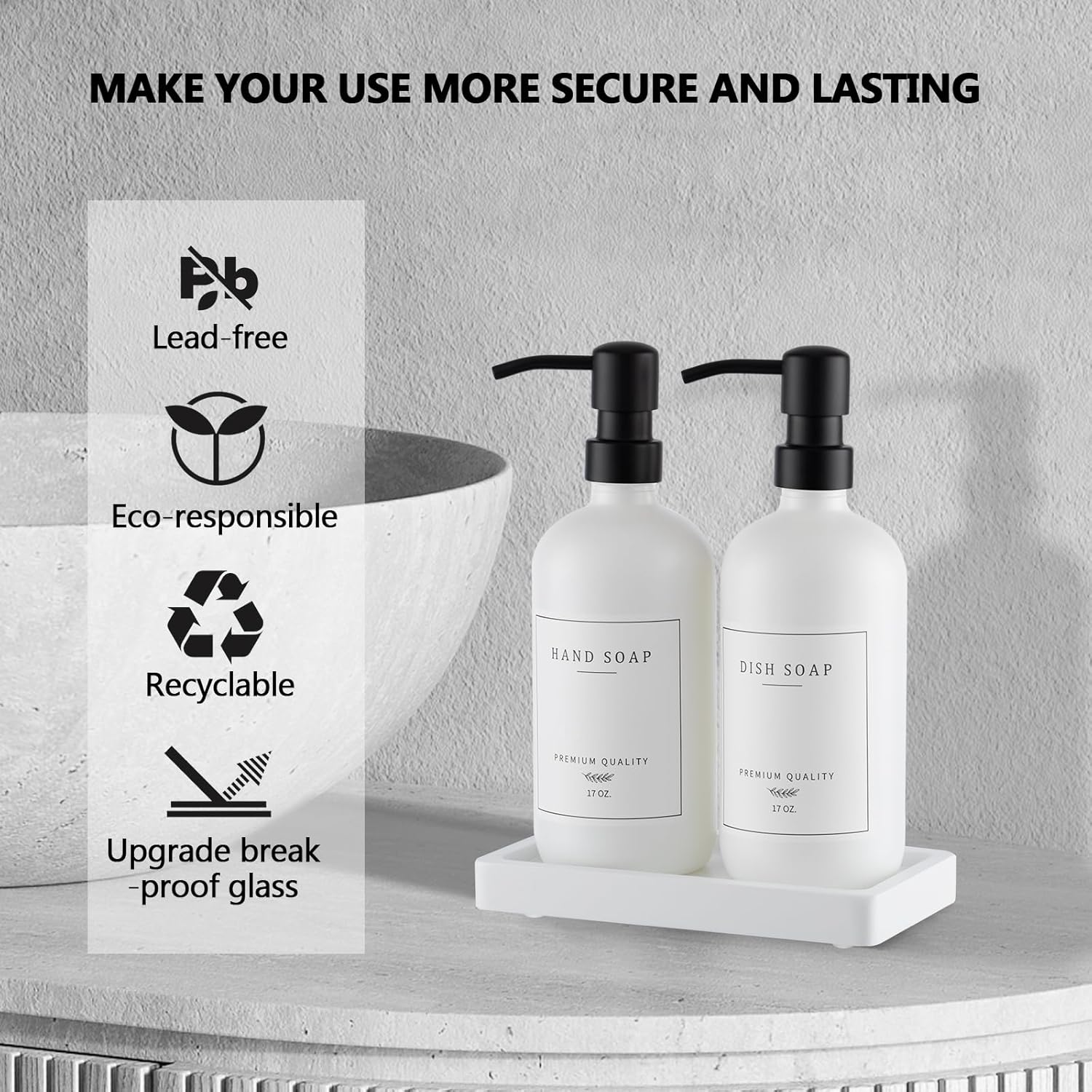 - MORE CLEAN AND ORGANIZED: This farmhouse style bathroom soap dispenser set is elegantly decorative and functional, keeps your kitchen or bathroom clean and classy, the white spill-proof tray with non-slip feet on the bottom is not like other wood that cracks easily, sturdy tray keeps your partner from moving the bottles all around the sink and doesnβt take up much room, make your kitchen area look more tidy and brings joy daily. Absolutely perfect for the modern farmhouse vibe or really any decor.