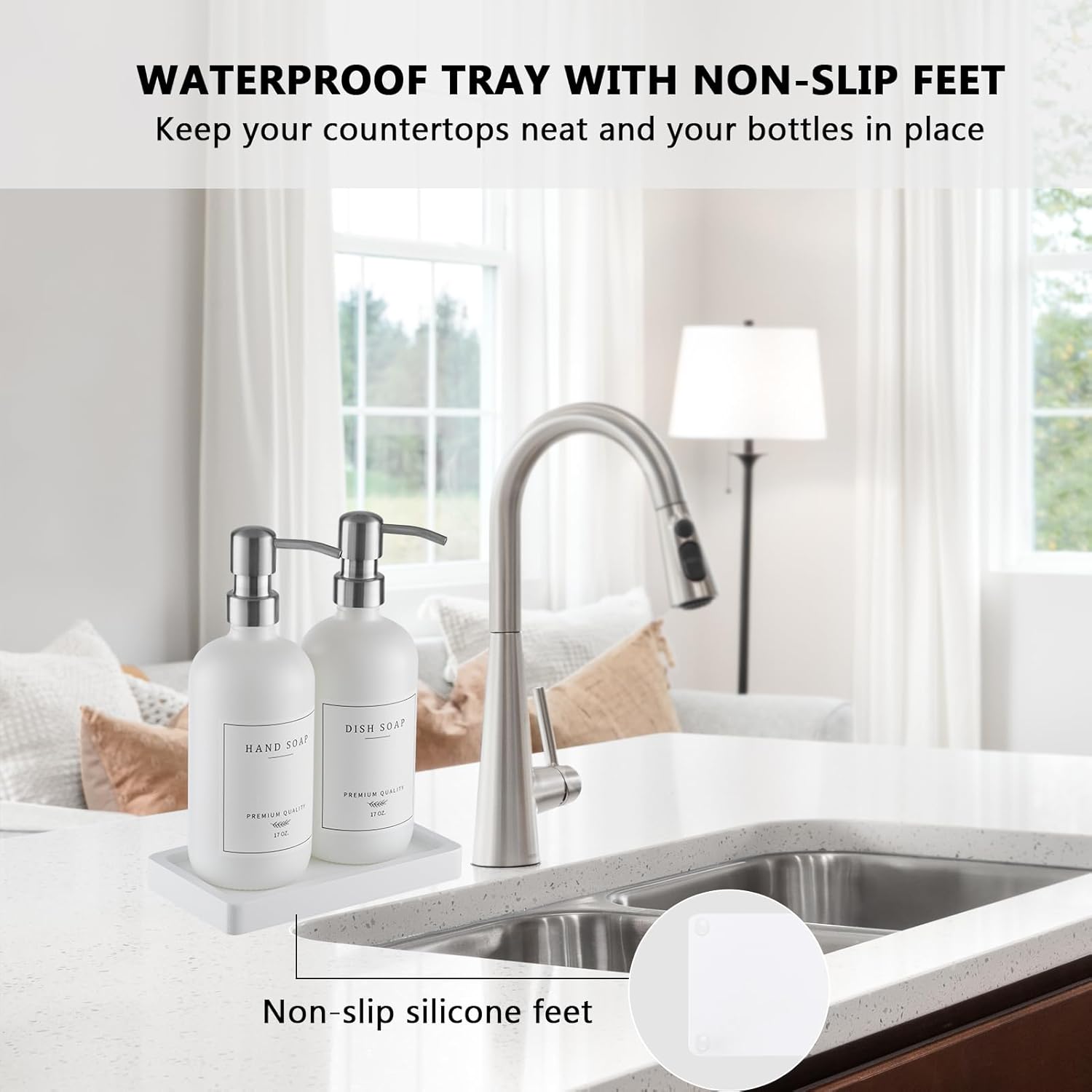 - MORE CLEAN AND ORGANIZED: This farmhouse style bathroom soap dispenser set is elegantly decorative and functional, keeps your kitchen or bathroom clean and classy, the white spill-proof tray with non-slip feet on the bottom is not like other wood that cracks easily, sturdy tray keeps your partner from moving the bottles all around the sink and doesnβt take up much room, make your kitchen area look more tidy and brings joy daily. Absolutely perfect for the modern farmhouse vibe or really any decor.