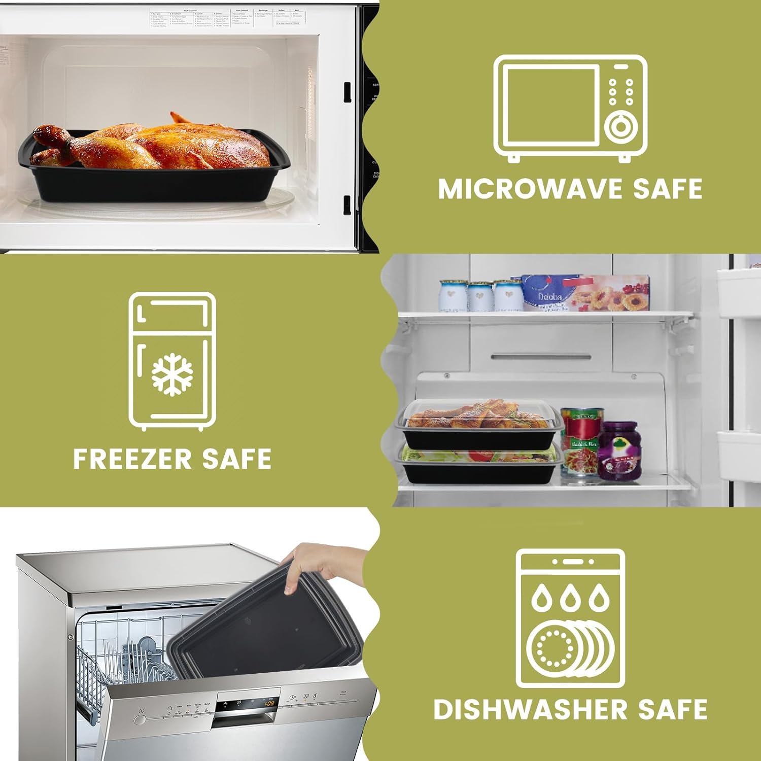 - γMicrowave, Dishwasher and Freezer Safetyγ These microwave-safe meal prep containers make mealtimes more efficient and convenient. Strong crack resistant material is dishwasher safe and can be washed in the top rack of the dishwasher repeatedly. And stackable and lightweight design allows for easy storage freezer.