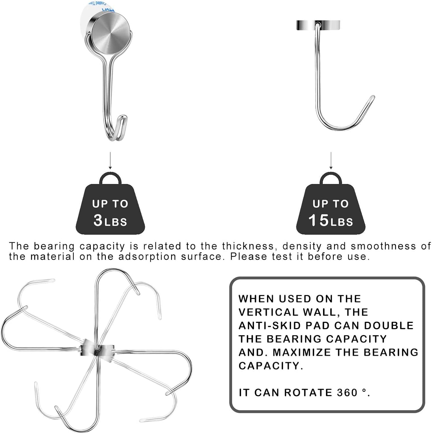 - 【Equipped with Non-slip Pad】Using with anti-slip pads which enables magnetic hook to bear more weight when use horizontally, such as refrigerators and iron doors, the load-bearing capacity can be double, so no need to worry about items slipping off. The maximum load capacity is 15LBS for horizontal walls and 3LBS for vertical walls.
