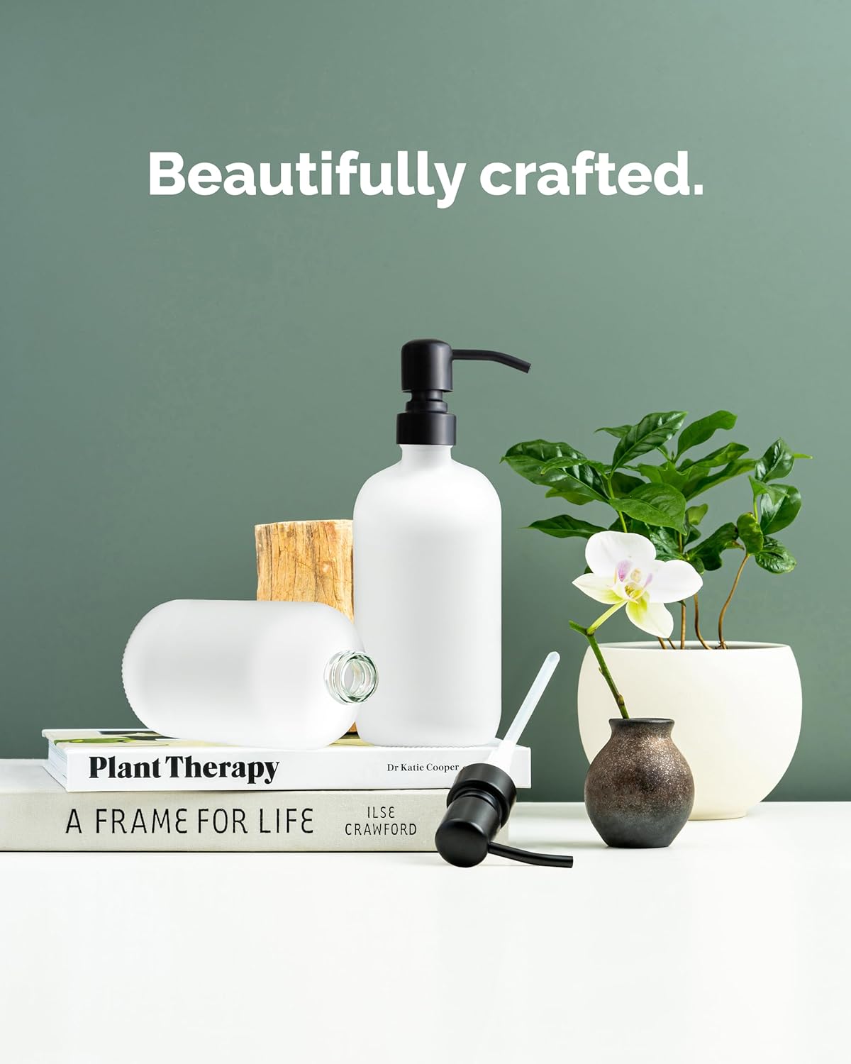 - PLEASE NOTE: These glass bottles have a semi-transparent matte finish, so COLORED SOAP MAY BE VISIBLE. For a clean, all-white look, we recommend using clear or light-colored soap.