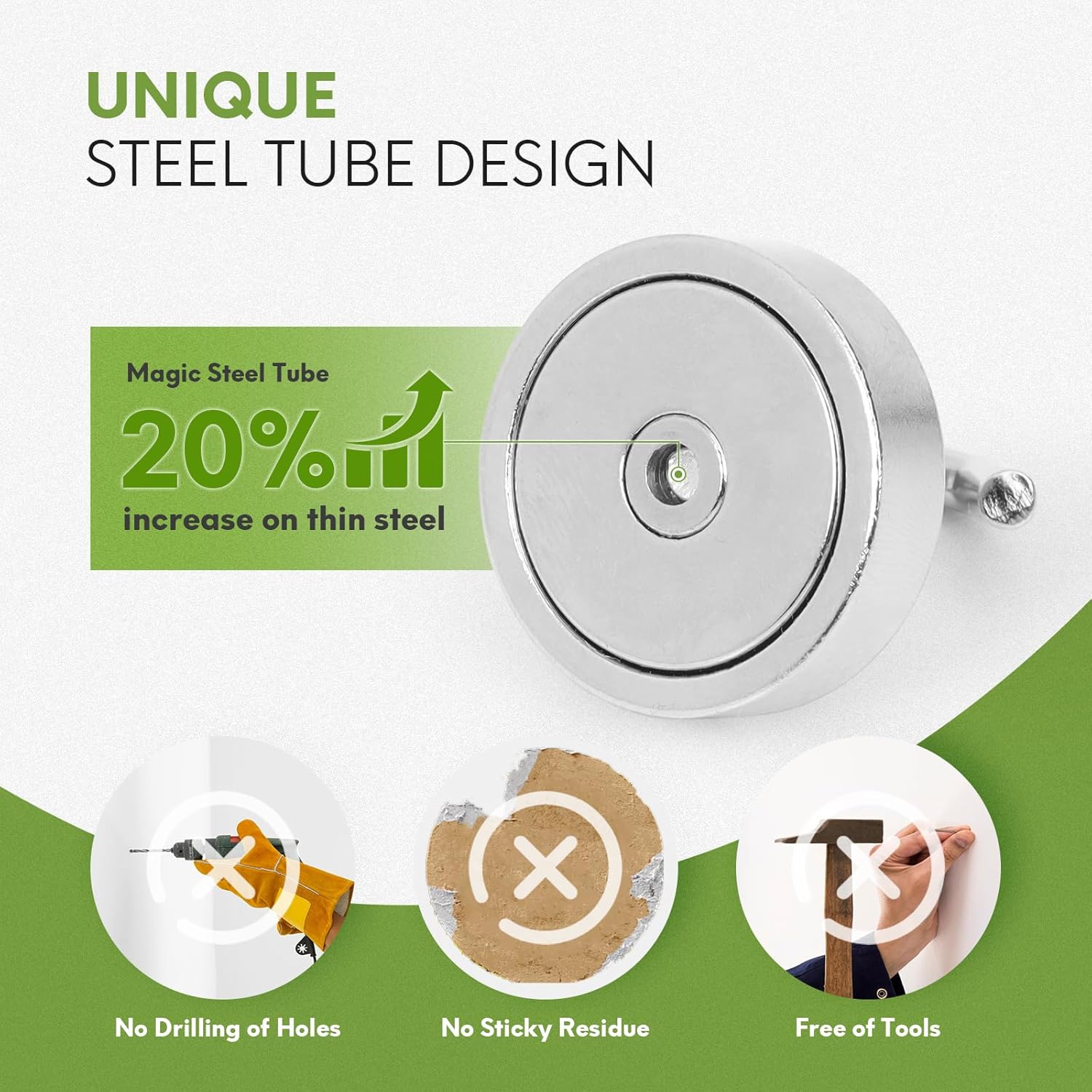 - ✔MAGIC STEEL TUBE DESIGN - Unique design of steel tube inside the base of magnetic hooks greatly increases the attractive force , especially on thin steel! It increase approximately 20% force comparing those none-tube magnets. it solves the problem of weak force on thin steel. Permanent magnetic hook with magic steel tube, strong magnetism lasts forever!