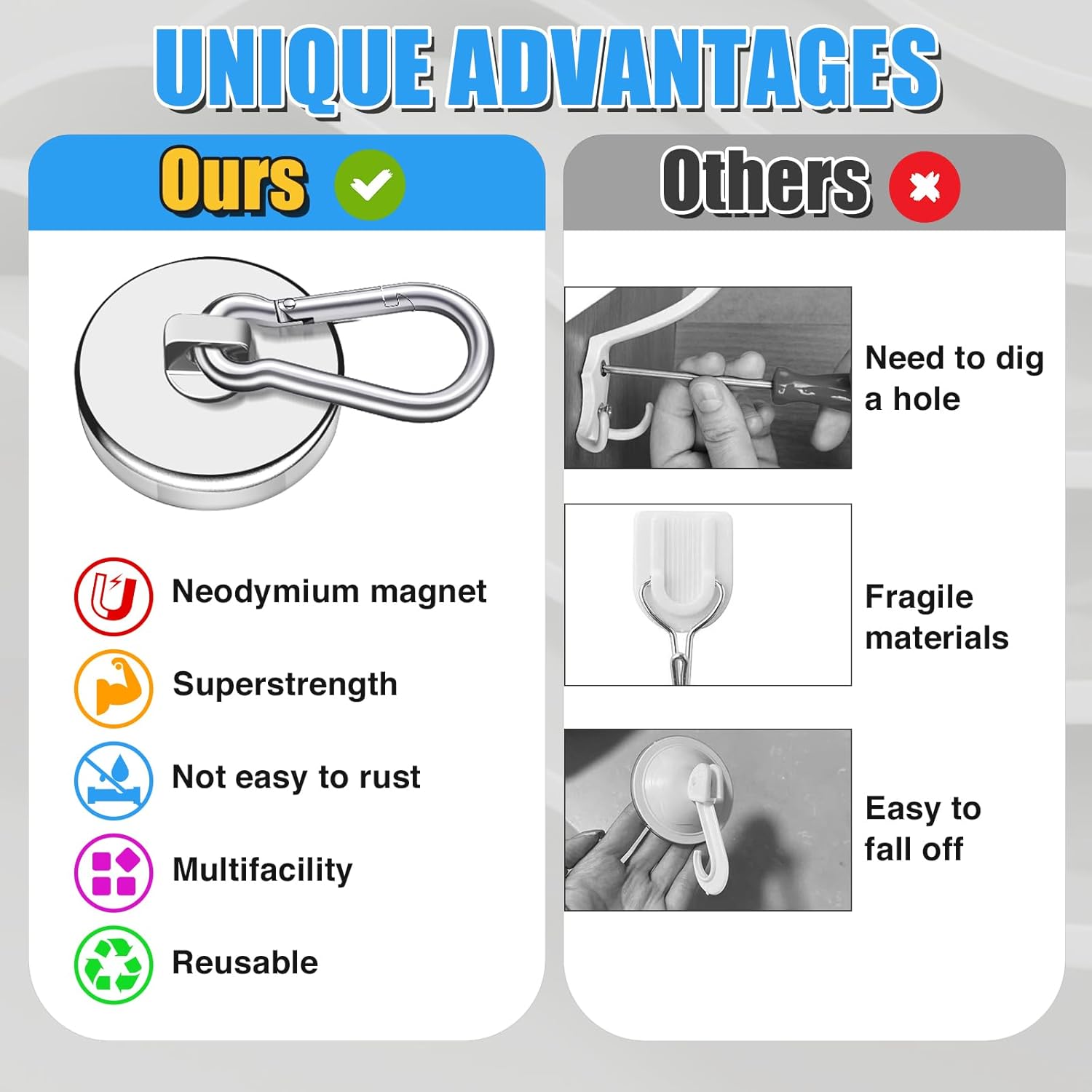- 【High-level Plating】- The excellent Ni+Cu+Ni three-layer electroplating process greatly enhances the anti-corrosion and scratch resistance of the magnetic fridge hooks, allowing you to reuse the large strong magnets hooks multiple times, making it the best choice for outdoor camping or home use.