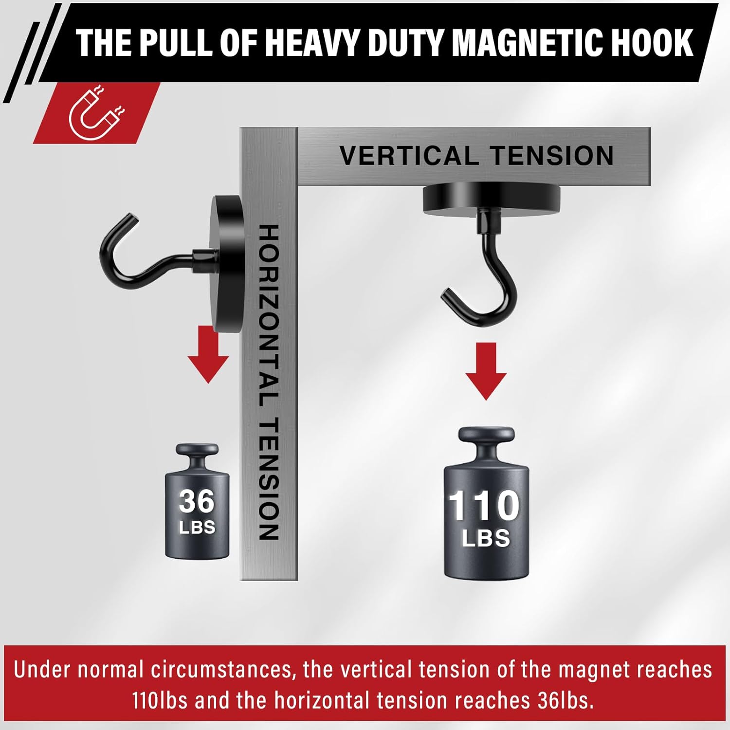 - 【STRONG MAGNETIC HOOKS】This magnetic hooks for hanging can support up to 110 pounds in vertical suspension and up to 36 pounds in horizontal suspension.The tension value we provide is the maximum ideal tension value measured by the machine,and the actual tension value that can be achieved in use is related to the material and thickness in contact.