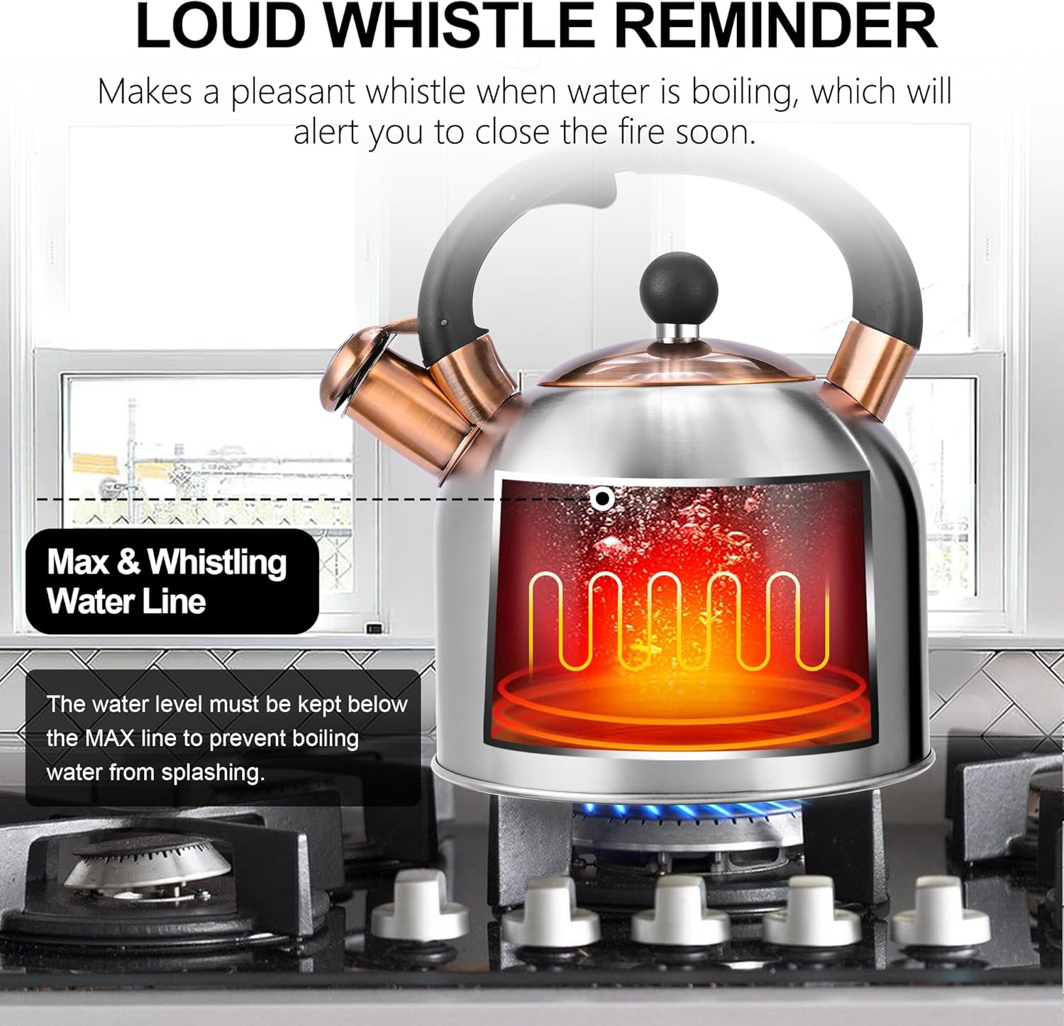 - Nice Partner In Your Kitchen- This 3.17-quart tea pots for stove top can satisfy the whole family to make tea (maximum boiling capacity: 2.64 quarts), the whistle will sound as soon as the water is boiled, loud but not harsh, preventing excessive boiling and reducing safety hazards. (Note: Do not touch the teapot body or open the lid when the water is boiling. Make sure to keep the lid closed when working.)
