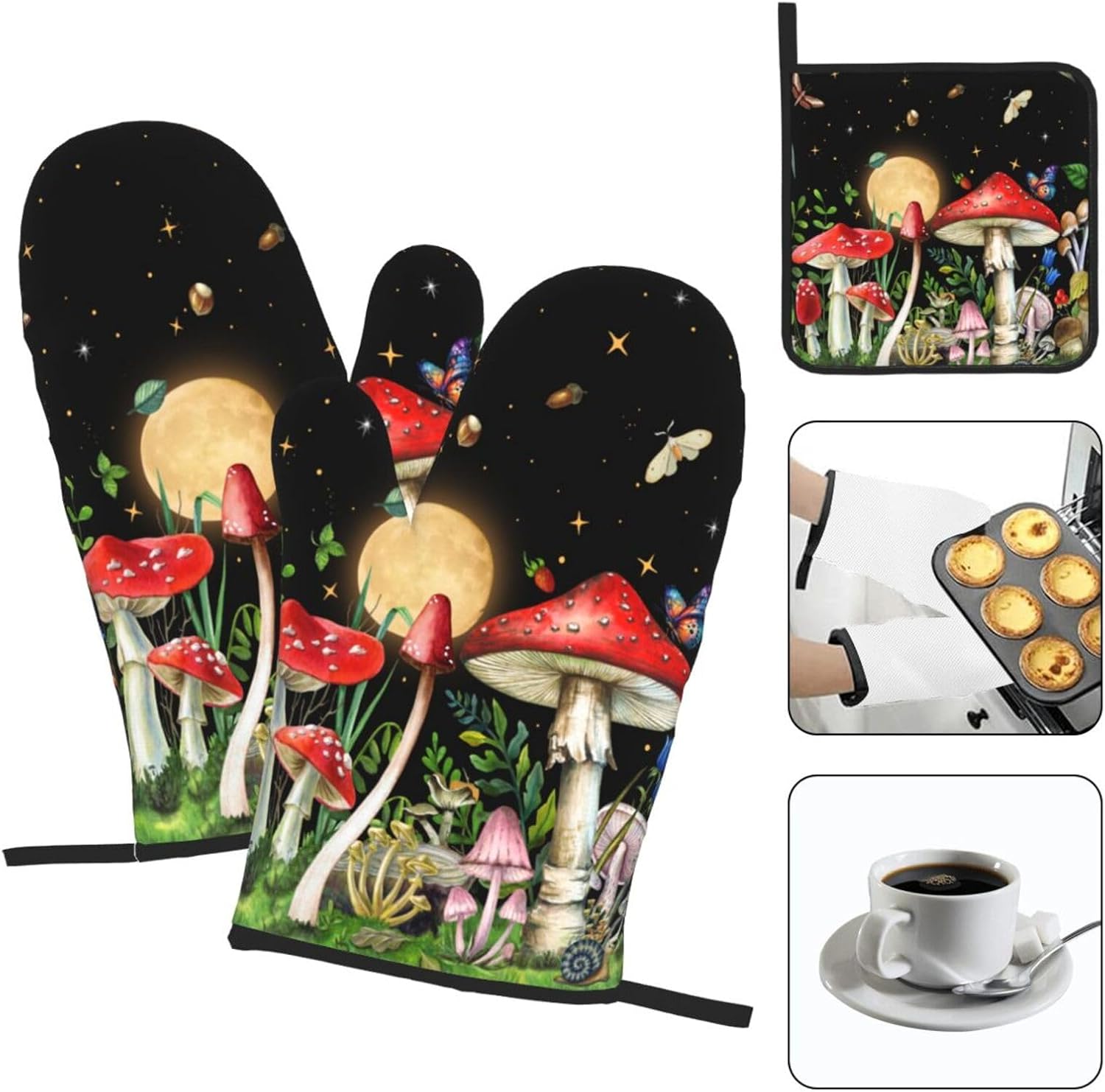 Cute Mushroom Oven Mitts and Pot Holders Sets of 3 Holiday Kitchen Decor Heat Resistant Witchy Hot Pads Oven Gloves for Cooking Grilling Baking