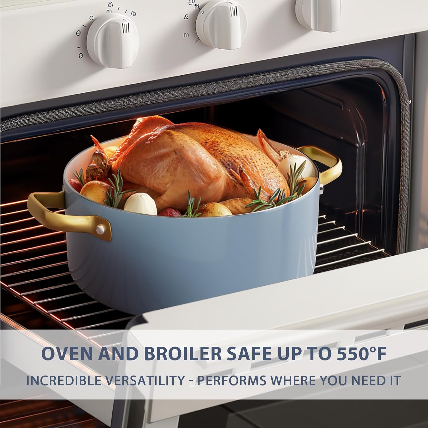 - 【For all Stovetops Except Induction】- The nonstick cookware set does not have a magnetic induction bottom, which allows faster heating on other cooktops, saving time and energy. Oven safe up to 550°F