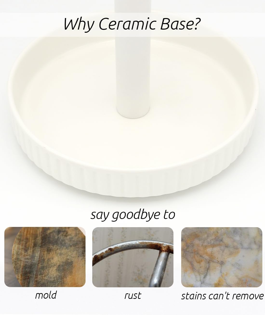 - EASY-TO-CLEAN CERAMIC BASE: Our paper towel holder features a ceramic base that resists stains, discoloration, and rust, ensuring long-lasting use. The high-rim design prevents water from the countertop from soaking into your paper towels.
