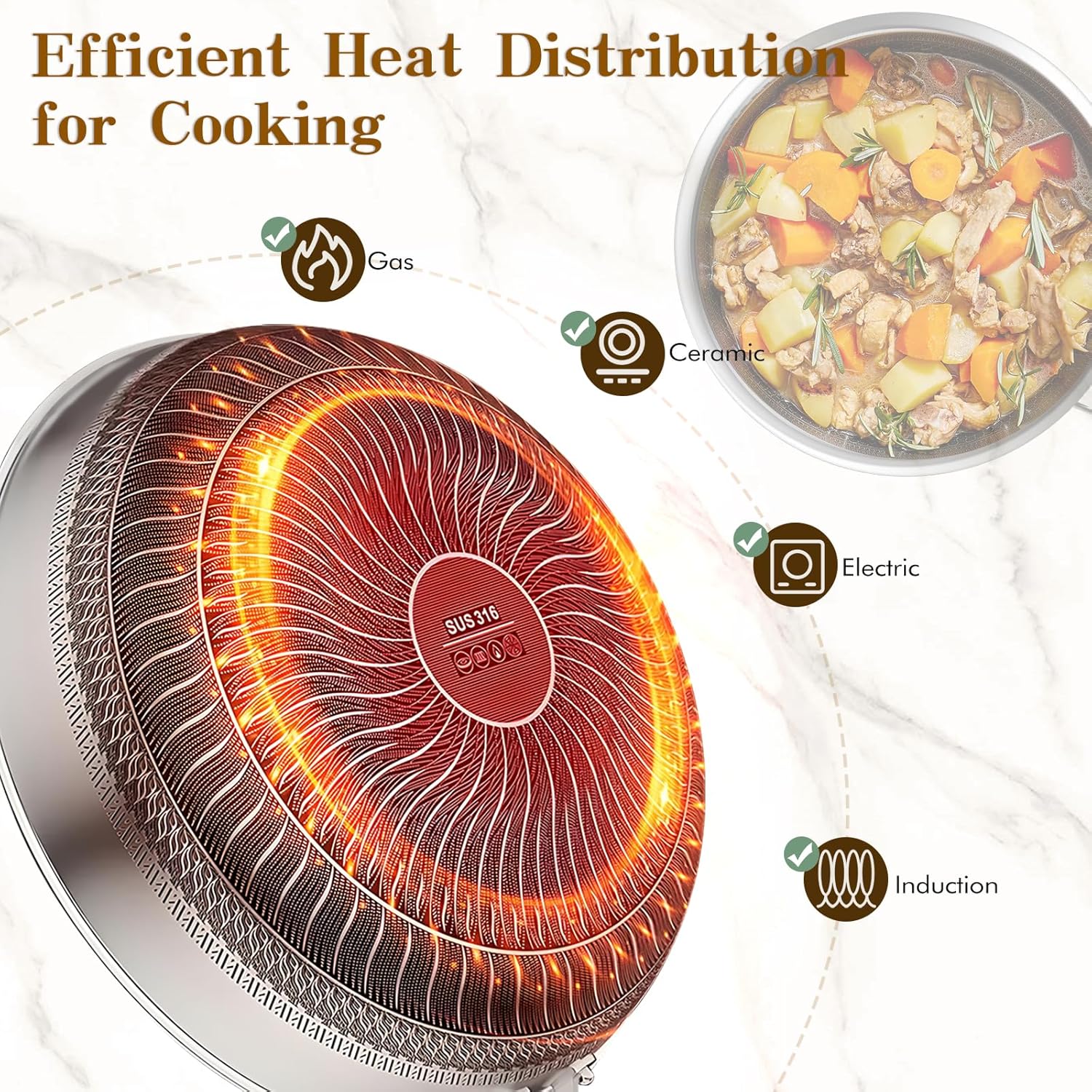 - γNo chemical coating, Healthy cooking-Technology for Superior CookingγOur skillet features advanced tri-ply construction, combining aluminum sandwiched between two layers of high-quality stainless steel. This innovative design enhances conductivity for even heating while providing the durability and searing power of stainless steel