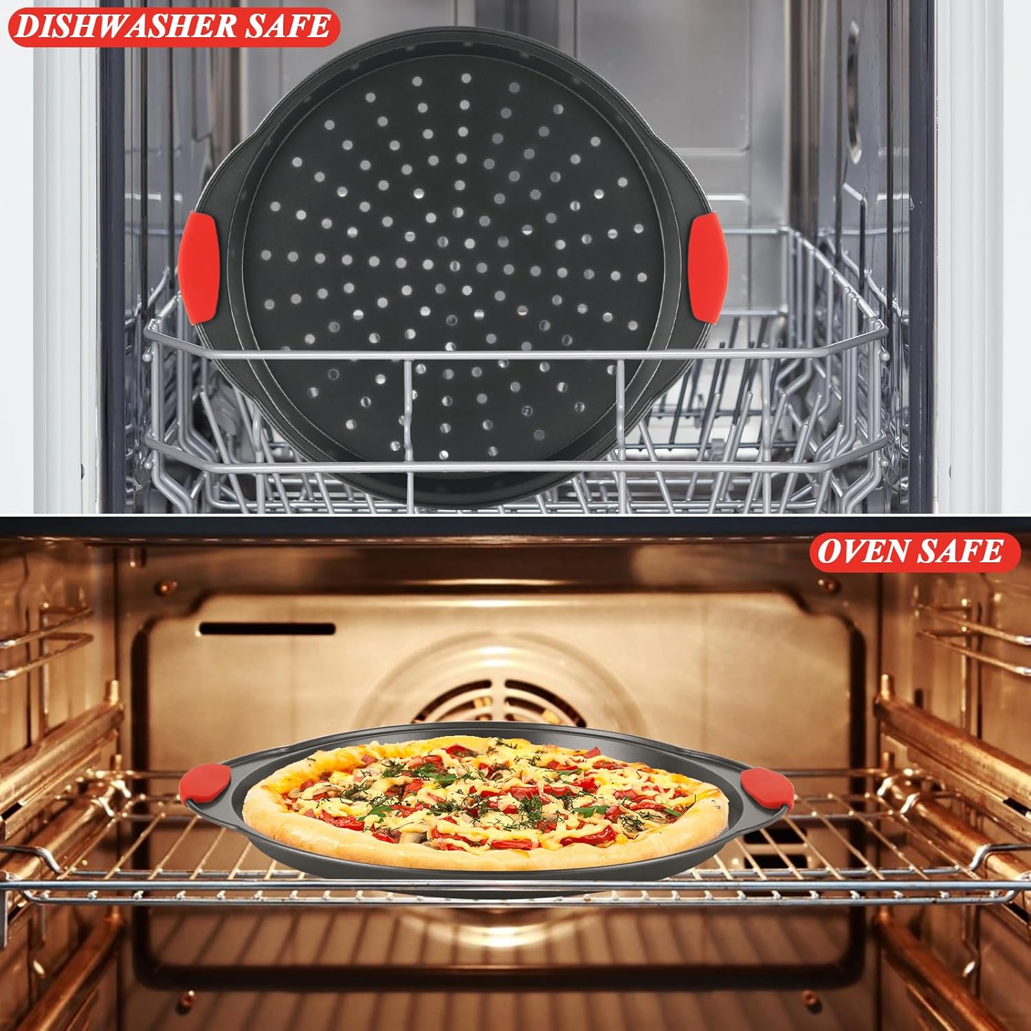 - Superior Material: Made of heavy duty food-grade carbon steel, Pizza Pan Plates are BPA-free, featuring silicone handles that is convenient to carry and transport without injury.