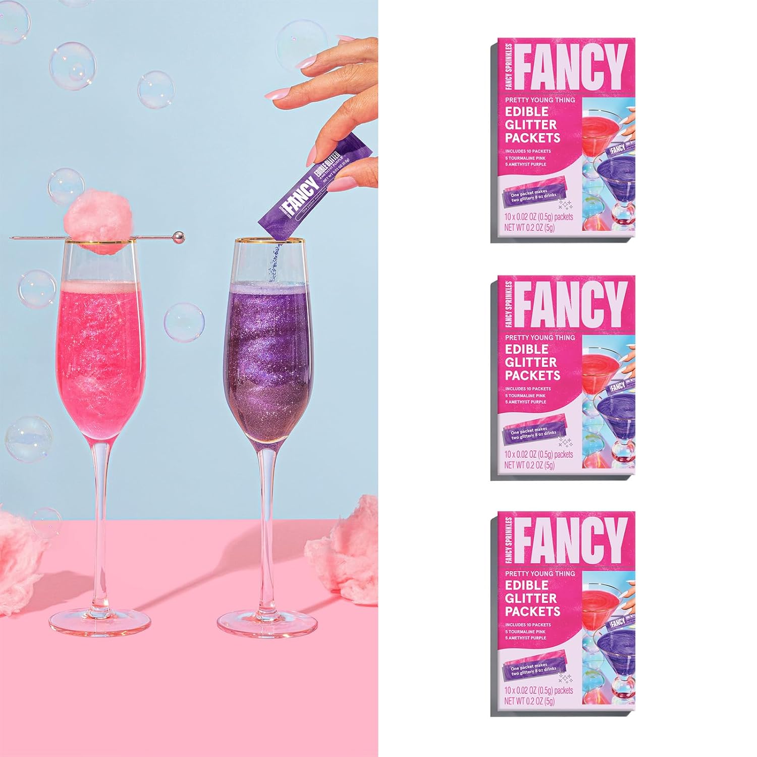 - Effortlessly transform any moment—and your drink—by adding FANCY SPRINKLES Fancy Edible Glitter Packets to beverages, bubbly, and cocktails!