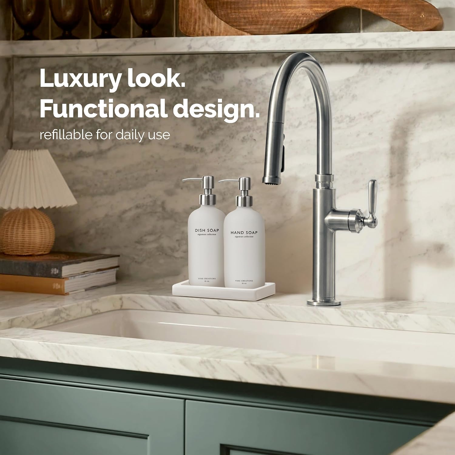 - STYLE YOU CAN FEEL β Heavier than standard dispensers, this hand and dish soap dispenser set of 2 brings substance to your countertop. Built to last and made to impressβwith a matching ceramic tray that keeps your set tidy, stylish, and perfectly organized.