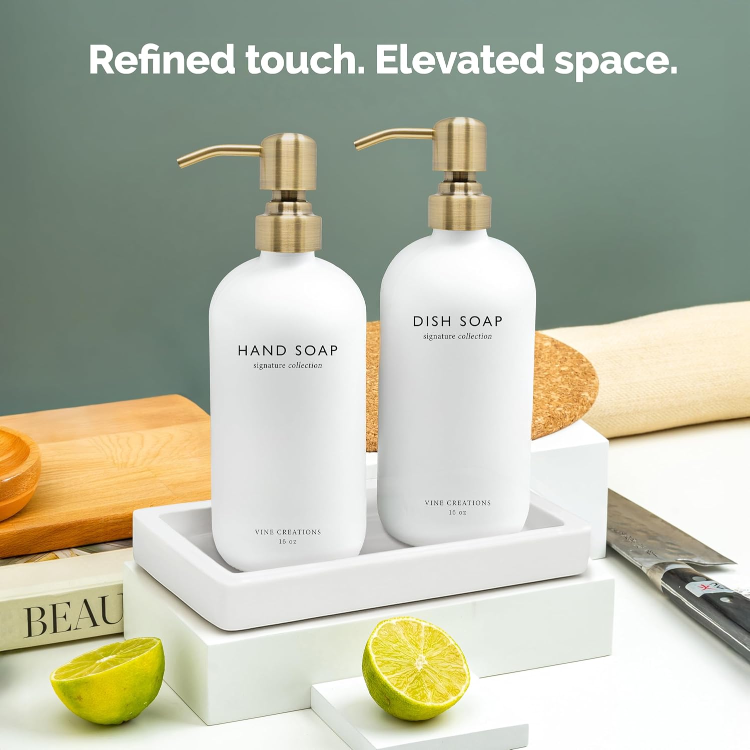 - BUILT TO PERFORM β Each dispenser is topped with a brushed brass stainless steel pump thatβs as durable as it is refined. Rust-resistant, smooth to use, and designed to complement any modern kitchen or bathroom.