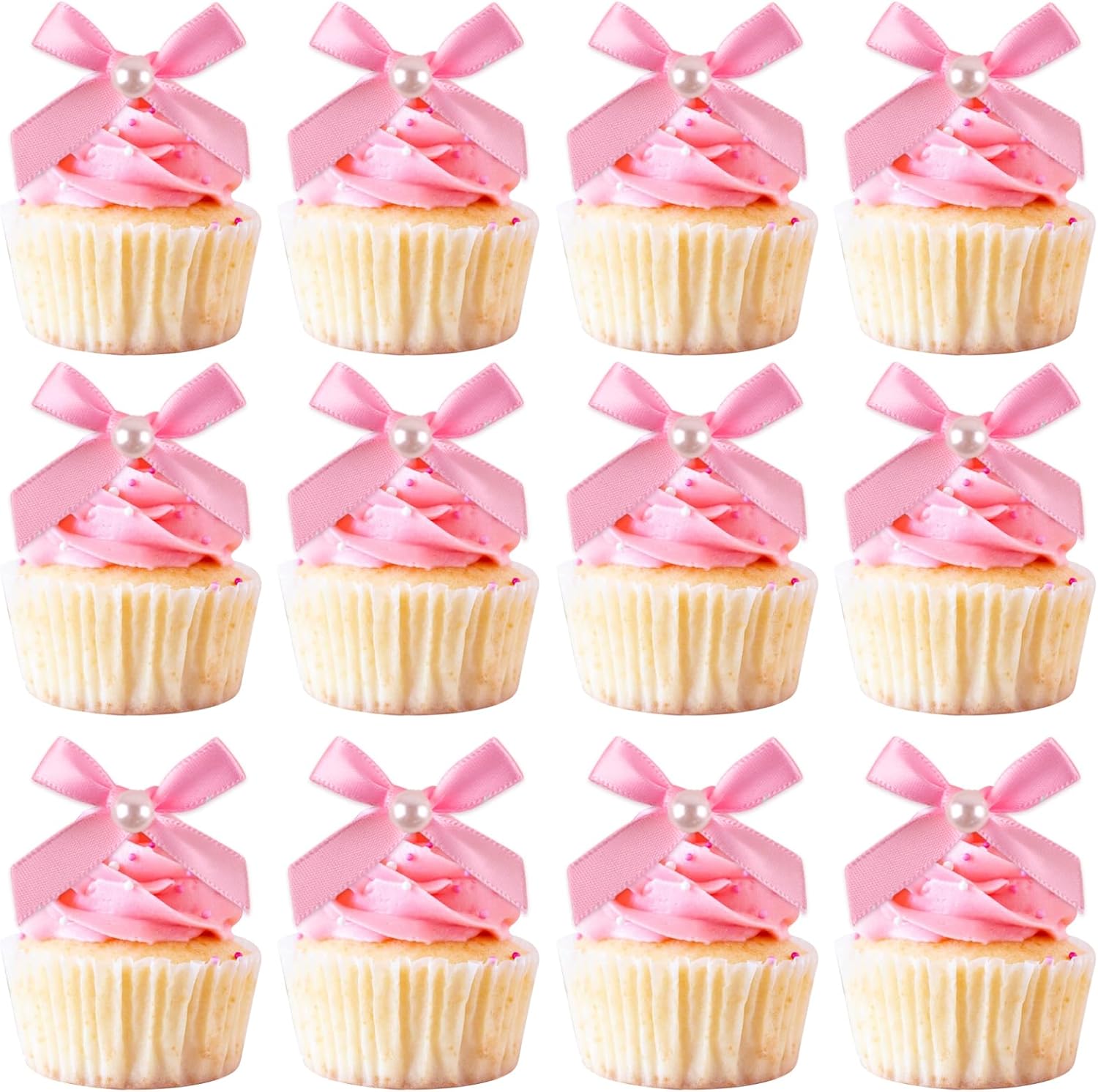 - 【High Quality Material】: These pearl bow cupcake decorations are made of quality satin fabric and comes with attachable clear plastic spikes; not easy to break, smooth, and shiny, offering a comfortable touch; Their cute and fun bow pattern which add charm and whimsy to your desserts, making your birthday party even more memorable.