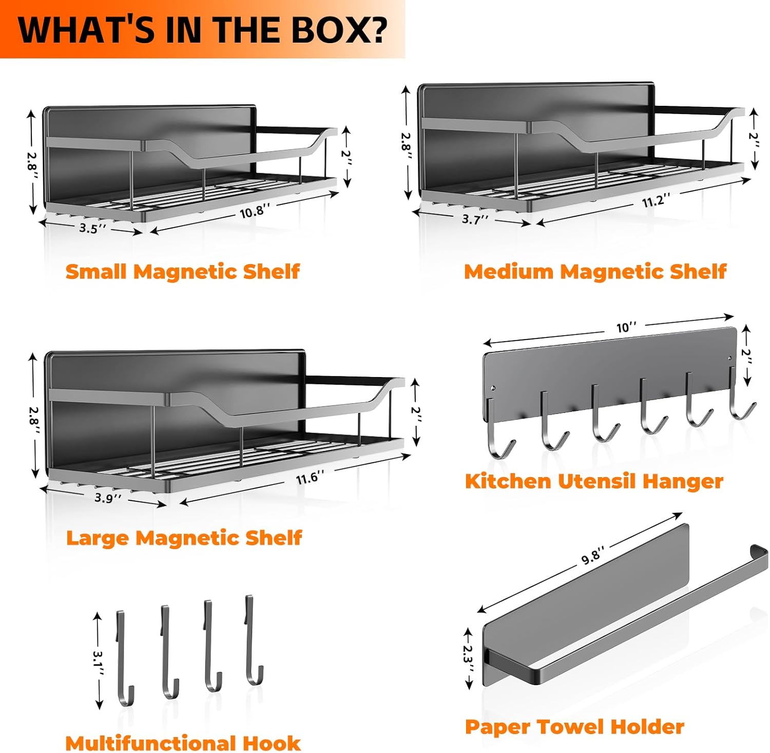 - 5 PACK MAGNETIC RACKS: Include 3 magnetic shelves in different sizes for spices, condiments, bottles,plus 1 magnetic Paper Towel Holder, 1 magnetic Utentils Hanger with 3 hooks for kitchen tools, oven mitts, or towels.