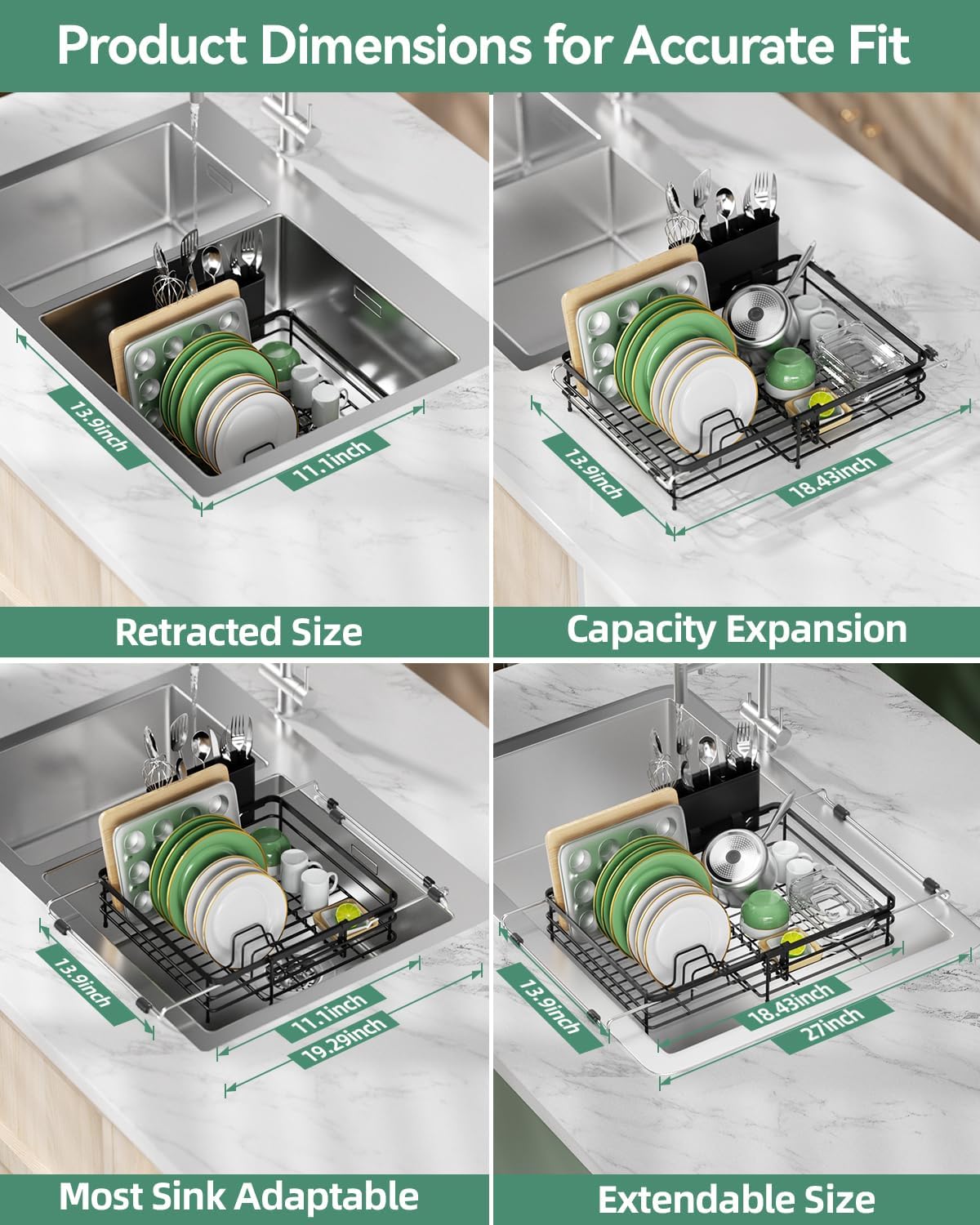 - γTruly Expandable, Real Capacity BoostγThe sink dish drainer not only extends its handles but also expands its full body, significantly increasing your drying space by 35%. This allows you to comfortably hold 8 plates, 4 bowls, 4 cups, plus all of your family's utensils. It can even serve as a fresh fruit and veggie draining basket