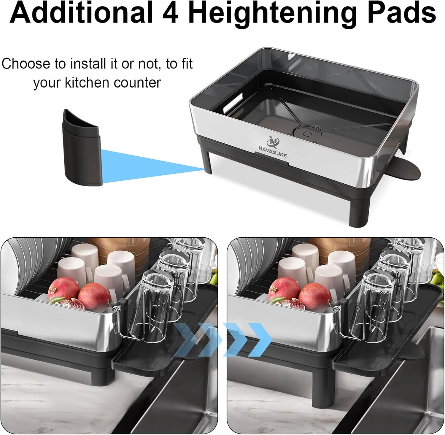 - 【Non-Slip & Adjustable Pads】4 non-slip pads prevent scratches; 4 heightening pads ensure smooth drainage in drop-in/countertop sinks. A stable sink dish drying rack (escurridor de platos).
