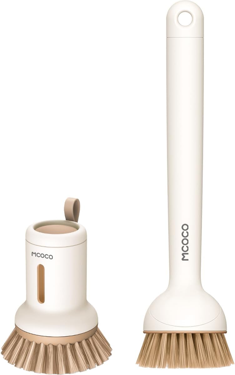 - Effortless Cleaning, Total Reach: The MCOCO 2 in 1 brush set combines a long handle brush with a rotating head that adjusts to any angle, perfect for deep pots and tall pitchers; Its shorter counterpart features a built-in soap dispenser and curved bristles that hug every curve and corner, ensuring no grease or grime is left behind; Together, they make quick work of any kitchen task