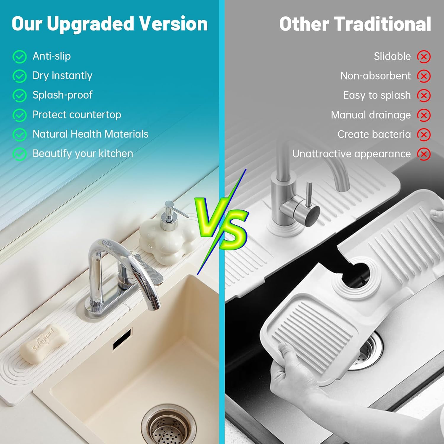 - Super Absorbent: This diatomaceous earth faucet mat absorbs water instantly, keeping your kitchen or bathroom countertop dry and clean. No more water stains or puddles around your sink.promoting a hygienic environment.