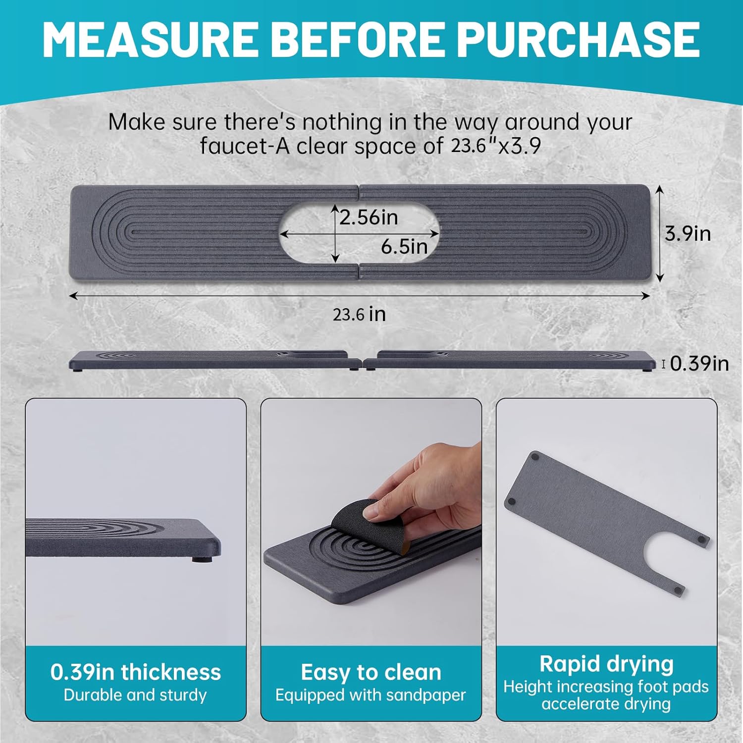 - Super Absorbent: This diatomaceous earth faucet mat absorbs water instantly, keeping your kitchen or bathroom countertop dry and clean. No more water stains or puddles around your sink.promoting a hygienic environment.