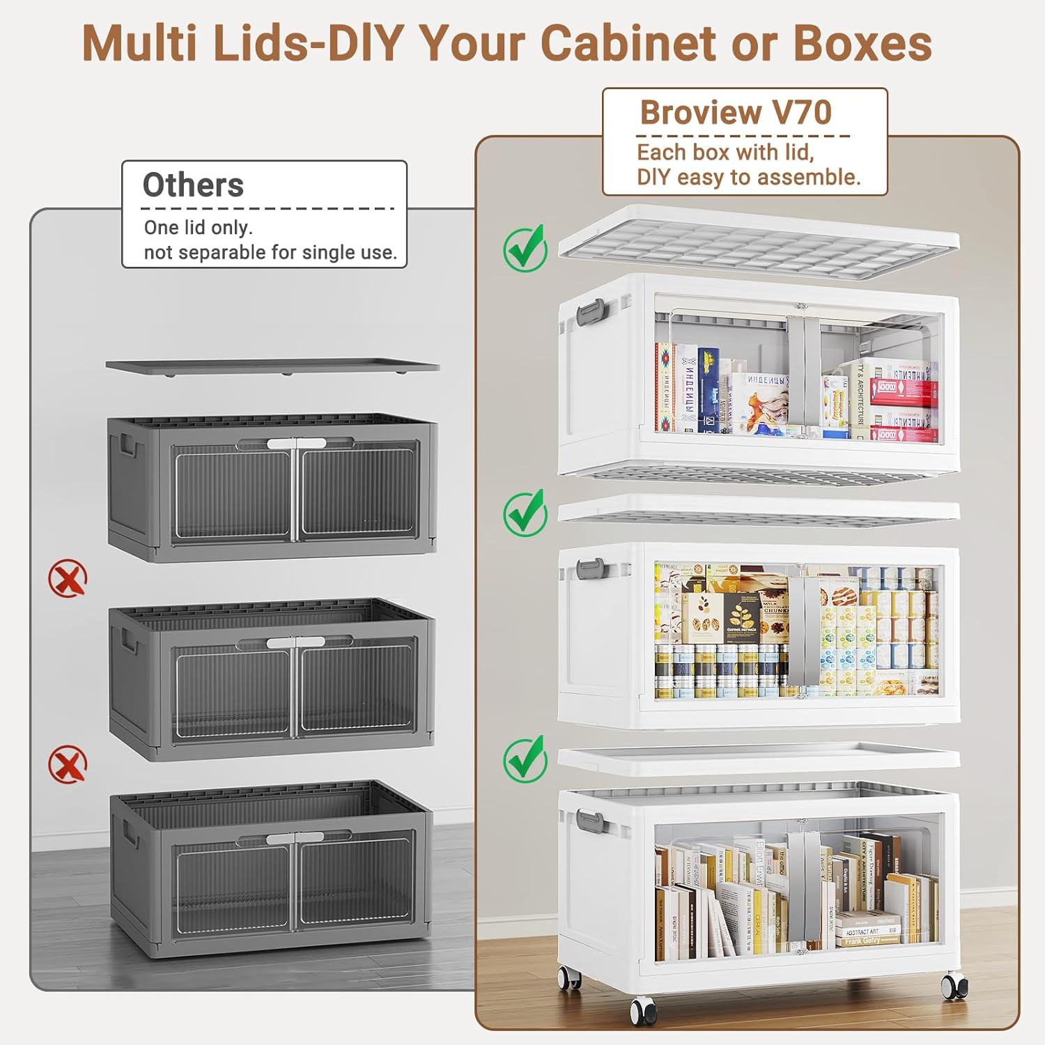 - 【Use Individually & Stack to Save Space】Each heavy-duty storage bin comes with its own lid, allowing you to use them individually or stack multiple plastic drawers(saves 50%+ space). The Broview V70 stackable storage bins with lids can fold flat to 3.55" thickness for off-season storage. Ideal for closets, dorms, bedroom, garage- keeps items organized