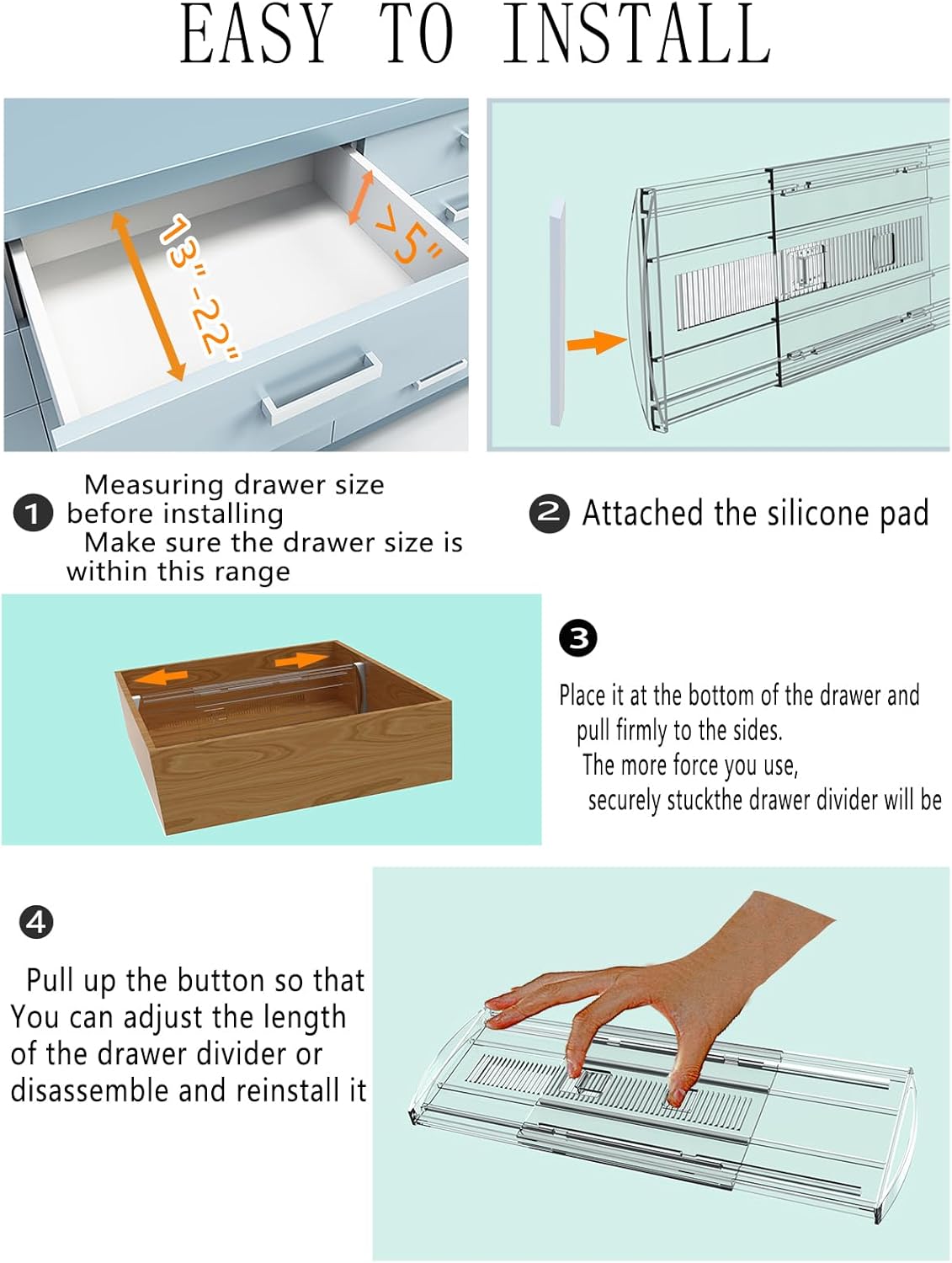 - 2:Easy to Use--1: Attach our matching EVA(Protect drawers from damage) 2:Place it at the bottom of the drawer and pull it forcefully on both sides. The harder you apply, Drawer Dividers Organizer the more firmly stand